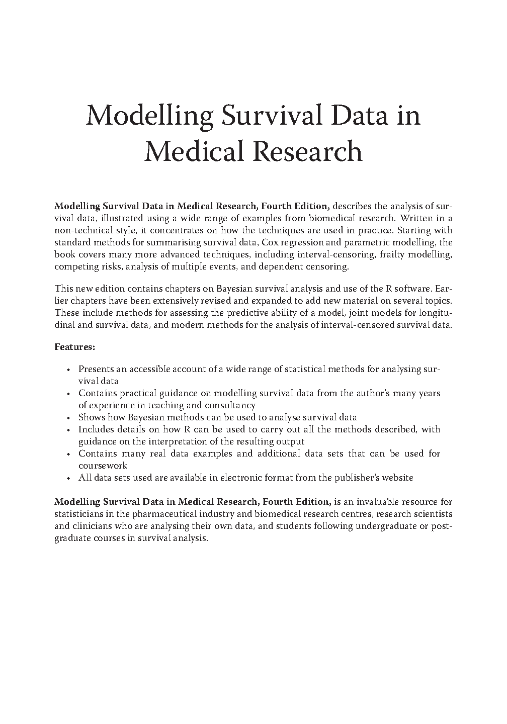 Unlock the power of biostatistics with the latest 2025/2026 edition of 'Modelling Survival Data in Medical Research, 4th Edition' by David Collett. This comprehensive guide is expertly designed to help students and researchers master the complexities of survival analysis. Dive into practical examples, clear explanations of statistical models, and real-world medical case studies. This resource is your ultimate tool to excel in your coursework and pass your exams on the very first attempt, eliminating the need for resits. Ideal for anyone in the medical, public health, or statistical science fields.