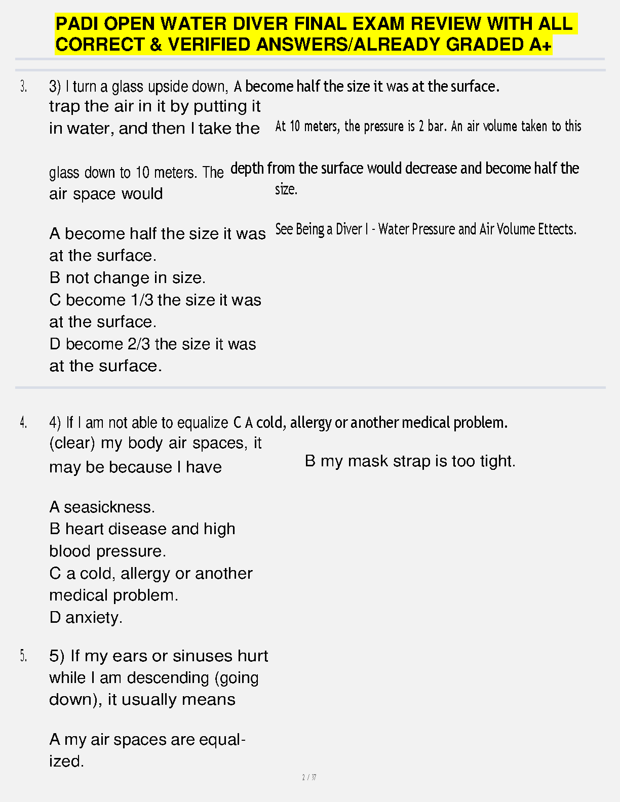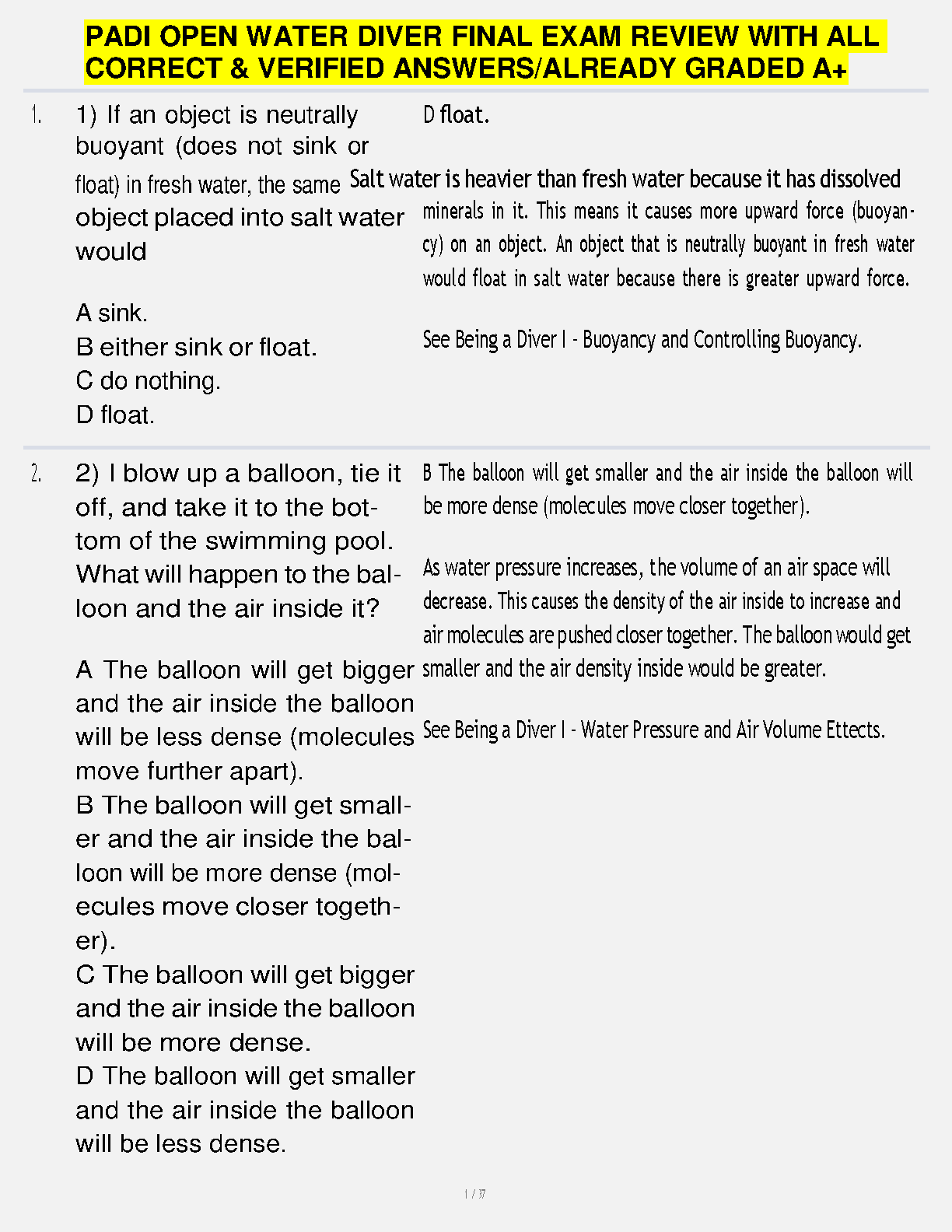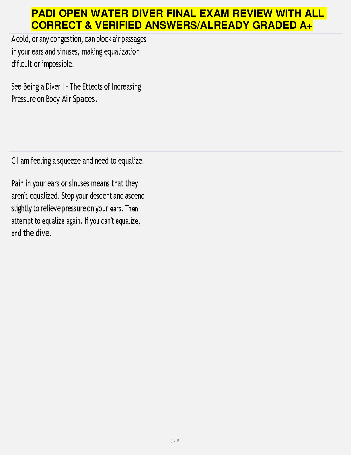 Master the PADI Open Water Diver final exam with this complete and verified test bank. This essential study guide contains an extensive collection of exam questions, each with a detailed, 100% correct answer, designed to help you score an A+. Confidently tackle topics like dive physics, safety protocols, and equipment use. Prepare effectively, pass your certification exam on the first attempt, and begin your scuba diving journey!