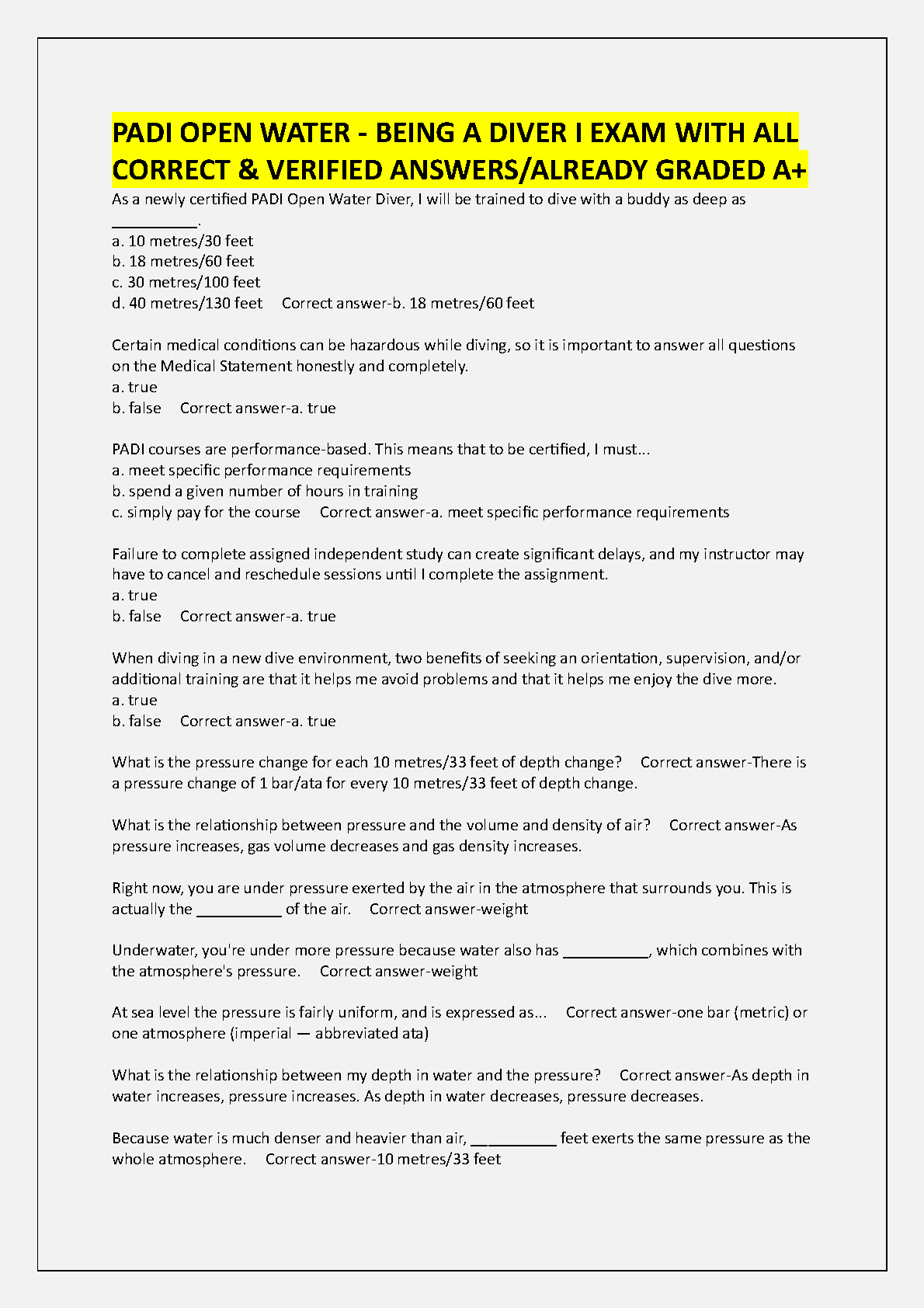 Dive into your PADI certification with confidence! This is the ultimate test bank for the PADI Open Water Diver course, focusing on the 'Being a Diver I' exam. Our 2025/2026 edition provides a complete collection of all potential exam questions, each paired with a correct, verified answer that has been graded A+. This essential study guide is expertly designed to help you master key diving concepts, from safety procedures to dive physics. Stop worrying about resits and ensure you pass your certification exam on the very first attempt. Download now to start your underwater adventure the right way and become a certified PADI Open Water Diver with ease!