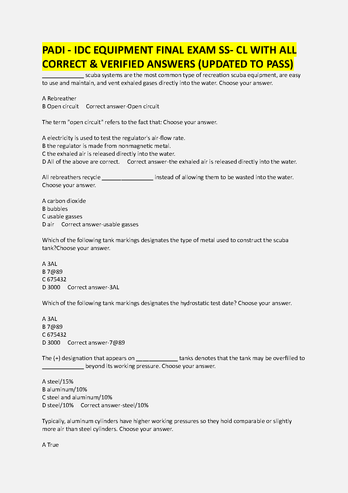 Ace your PADI Instructor Development Course (IDC) with our ultimate Equipment Final Exam Test Bank. This comprehensive 2025/2026 study guide is packed with real exam questions and 100% correct, verified answers, covering everything from regulators and open-circuit systems to tank markings. It's the perfect resource to help you study smart, build confidence, and pass your equipment exam on the first try, bringing you one step closer to becoming a certified PADI Instructor.