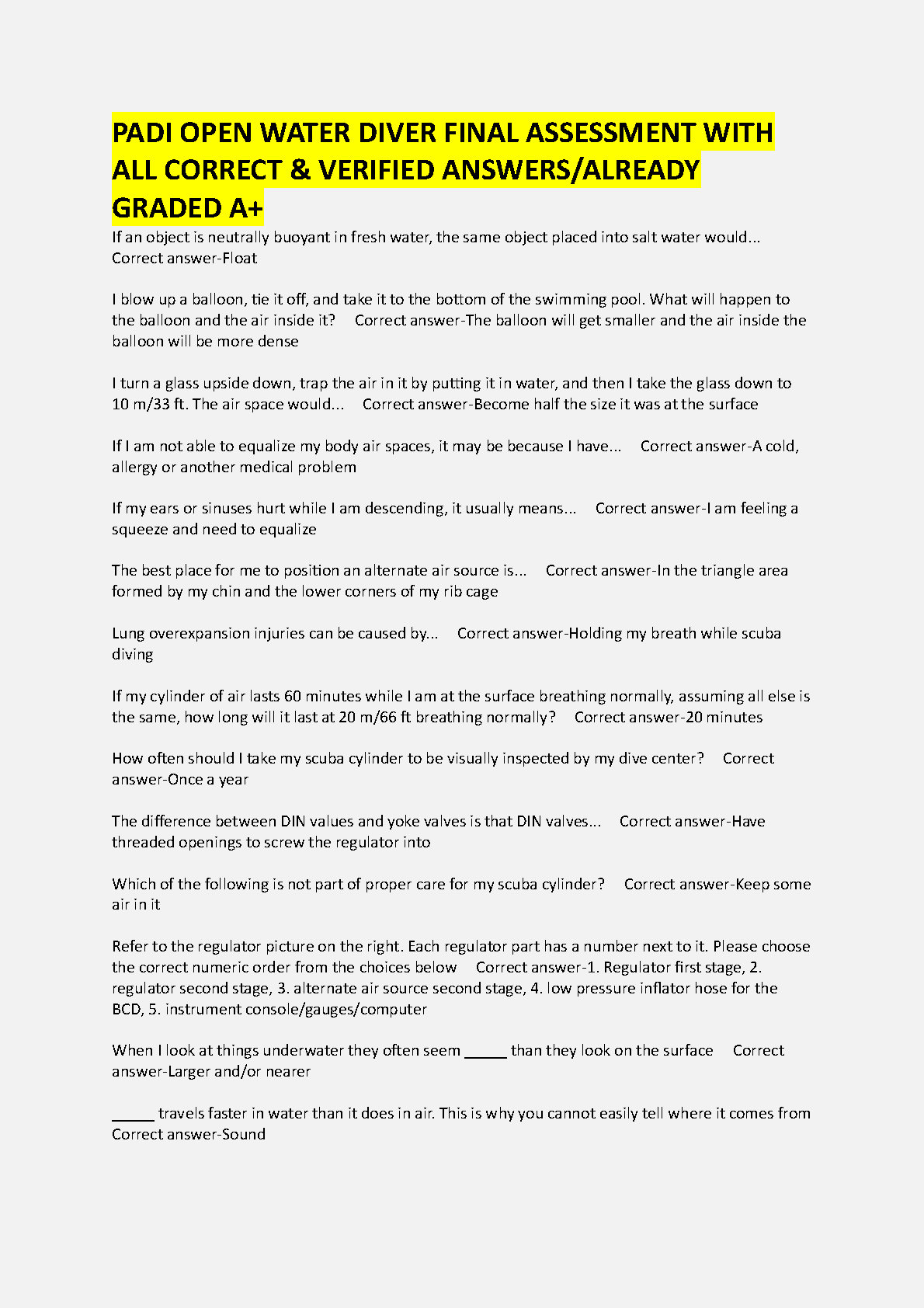 Ace your PADI Open Water Diver certification with this comprehensive test bank for the final assessment. This guide features a complete collection of questions paired with 100% correct and verified answers, ensuring you are fully prepared to pass on your first try. Covering all critical topics from buoyancy and pressure to equipment and safety, this resource is your key to achieving an A+ grade and becoming a certified diver. Download now and dive into your studies with confidence!
