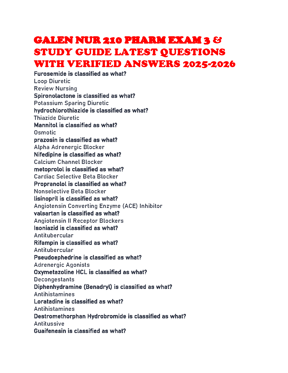 Master Galen College of Nursing's NUR 210 Pharm Exam 3 with our comprehensive study resource. This test bank features the latest exam questions and expertly verified answers for the 2025-2026 academic year, covering essential drug classifications like diuretics, beta-blockers, ACE inhibitors, and more. Designed to streamline your study process, this guide will help you grasp key concepts efficiently, giving you the confidence to pass your exam on the first attempt and avoid resits.