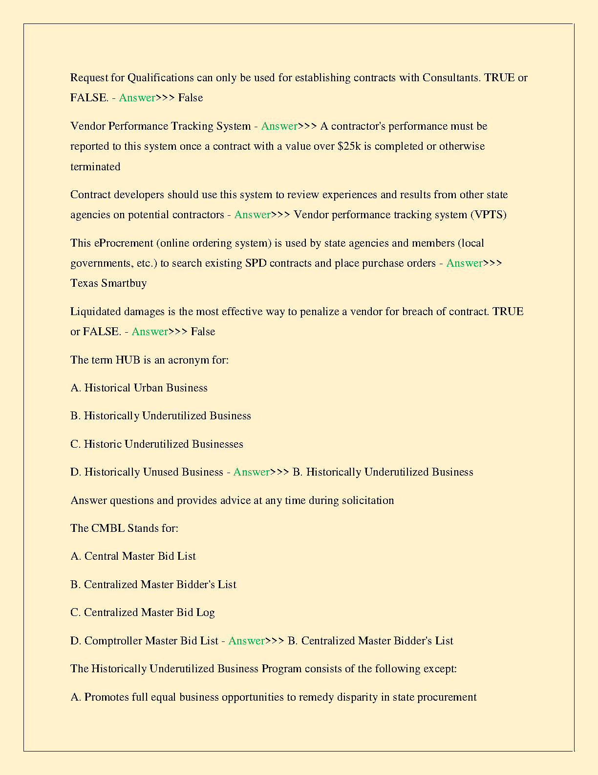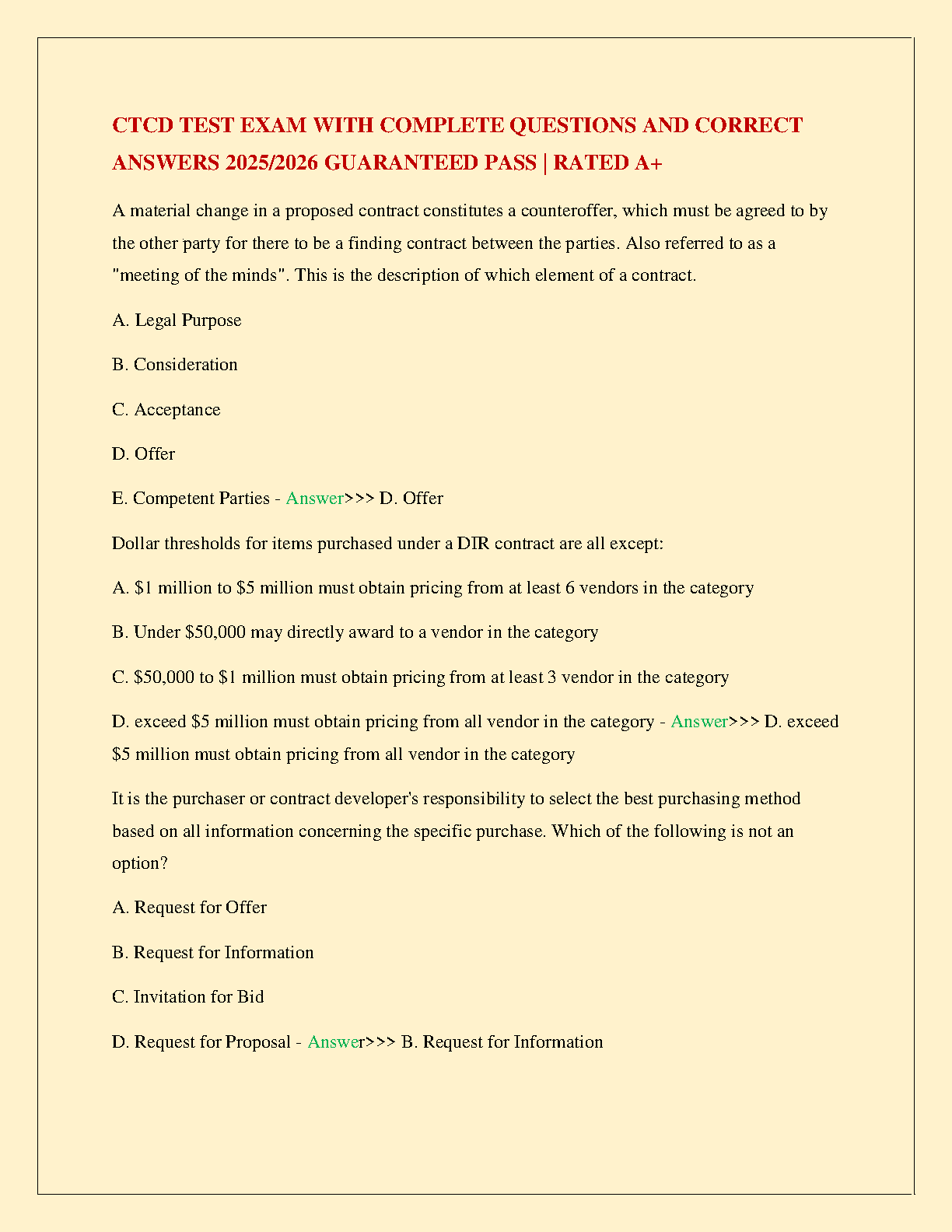Ace your Certified Texas Contract Developer (CTCD) certification exam with our latest 2025/2026 test bank! This comprehensive resource is packed with a full set of exam questions and meticulously verified answers, designed to ensure you pass on your first try. Gain a deep understanding of key topics including the elements of a contract, counteroffers, DIR contract thresholds, and various purchasing methods like RFIs and RFPs. Our A+ rated guide provides everything you need to study effectively, avoid resits, and achieve your CTCD certification with confidence. Download now for immediate access to your path to success.