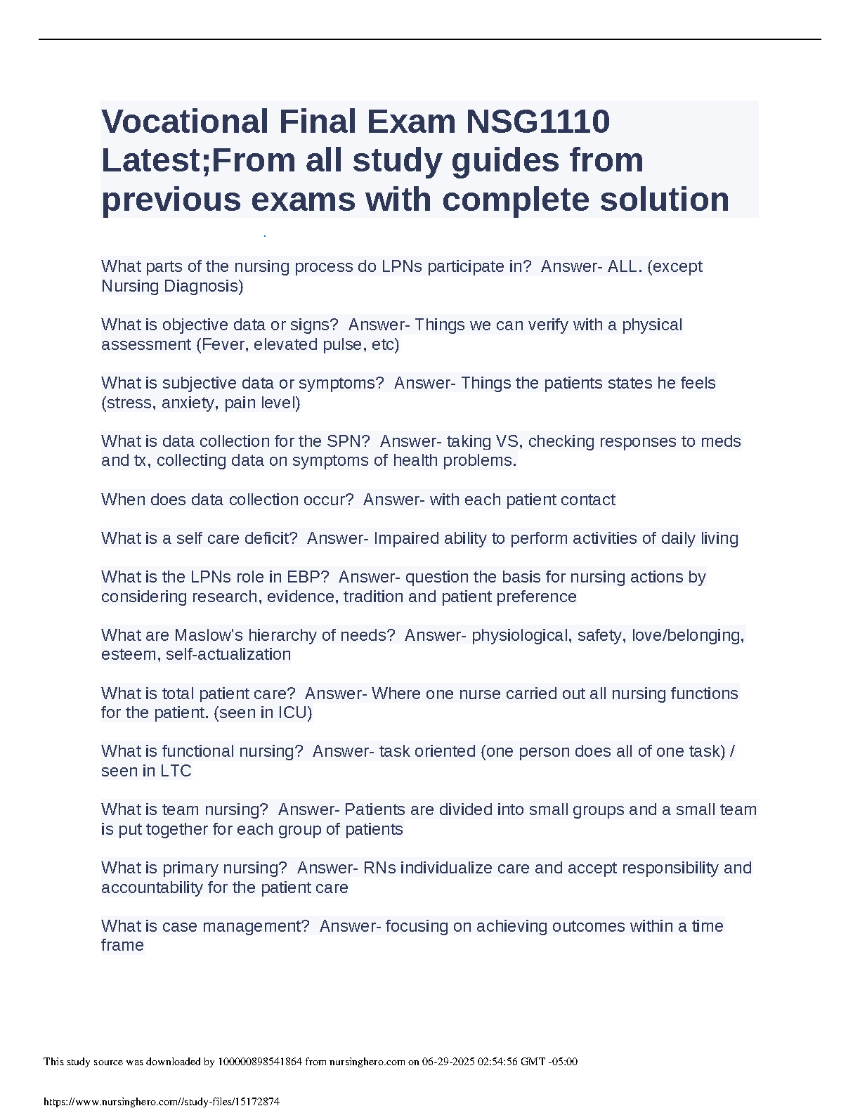 Unlock success in your Vocational Nursing program with our latest 2025/2026 Test Bank for the NSG1110 Final Exam. This comprehensive study guide is expertly compiled from previous exams and essential study materials, providing you with a complete set of questions and verified answers. Master crucial topics such as the nursing process, the roles of LPNs, objective vs. subjective data, Maslow's hierarchy, and various patient care models. Designed for ultimate exam readiness, this resource helps you study smarter, build confidence, and pass your NSG1110 final on the first try. Say goodbye to exam anxiety and hello to top grades!