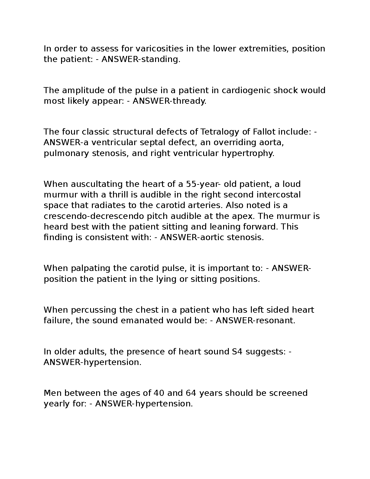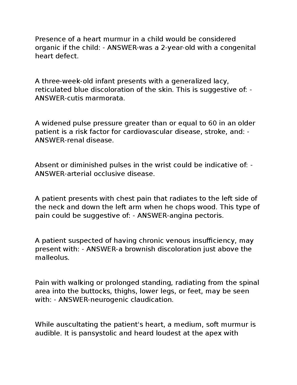 Master the 3P Cardiovascular exam with our latest 2023-2024 Test Bank. This comprehensive resource is packed with a wide range of exam-style questions and 100% accurate, verified answers. It covers all essential topics, including myocardial infarction, thromboangiitis obliterans, orthostatic hypotension, and more, providing you with the knowledge and confidence needed to excel. Download this essential study guide to guarantee your success and pass with flying colors.