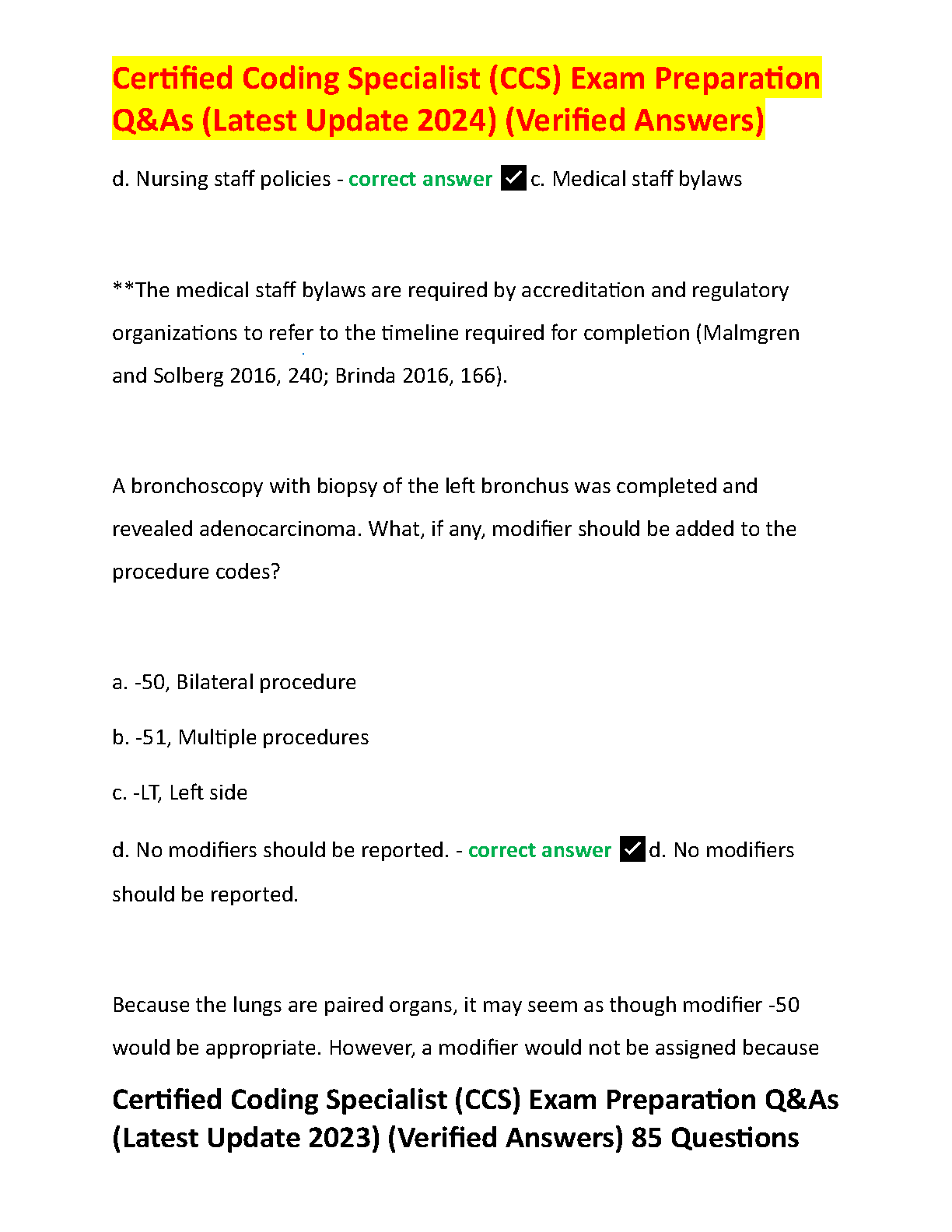 Unlock your success on the Certified Coding Specialist (CCS) exam with our premium 2024-2025 test bank. This essential study guide features a complete set of exam-style questions, each with verified answers and in-depth rationales to ensure you master the material. Explore critical topics like procedural coding, correct modifier usage, and official guidelines. Designed to help you pass confidently on your first attempt, this resource is your key to achieving CCS certification. Avoid resits and fast-track your career in medical coding today!