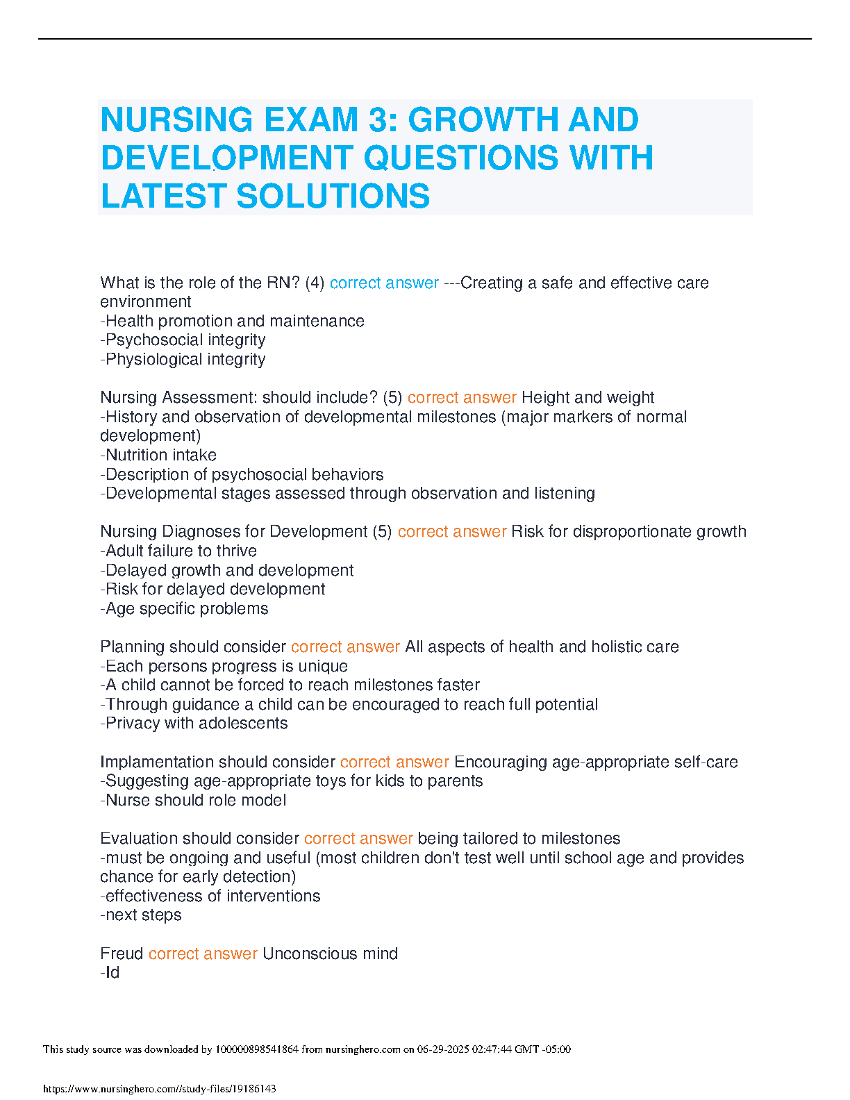 Master the essentials of Growth and Development for your upcoming Nursing Exam 3 with this comprehensive test bank. This study resource provides a detailed collection of questions and the latest, verified solutions, covering all critical topics you'll face. Dive deep into the role of the RN, nursing assessments for developmental milestones, formulating nursing diagnoses, and effective planning and implementation strategies. This guide is designed to sharpen your knowledge, boost your confidence, and help you ace your exam on the first try. Get immediate access to the answers you need to succeed.