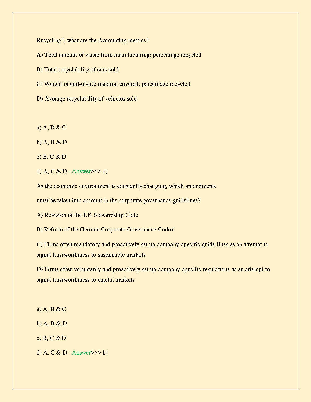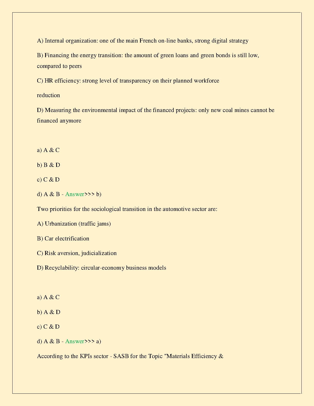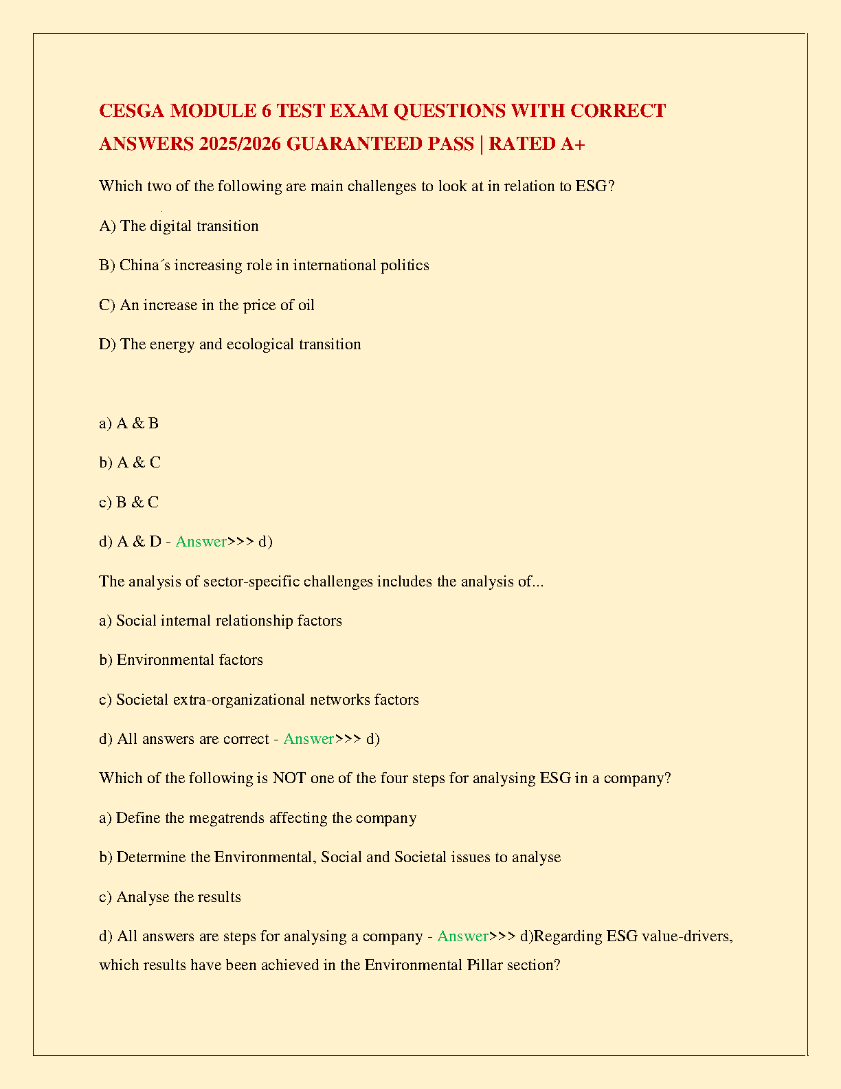 Ace your Certified ESG Analyst (CESGA) exam with our premier test bank for Module 6, fully updated for the 2025/2026 academic year. This A+ rated resource provides an extensive collection of real exam questions accompanied by verified, correct answers. Designed to help you master the core concepts of ESG analysis, this guide is your key to passing the exam on your first try, avoiding costly resits. Get immediate access to the study materials that guarantee success and boost your confidence for exam day.