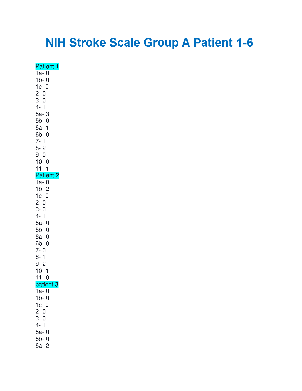 NIHSS Certification Exam Test Bank: Verified Answers for Group A Patients 1-6