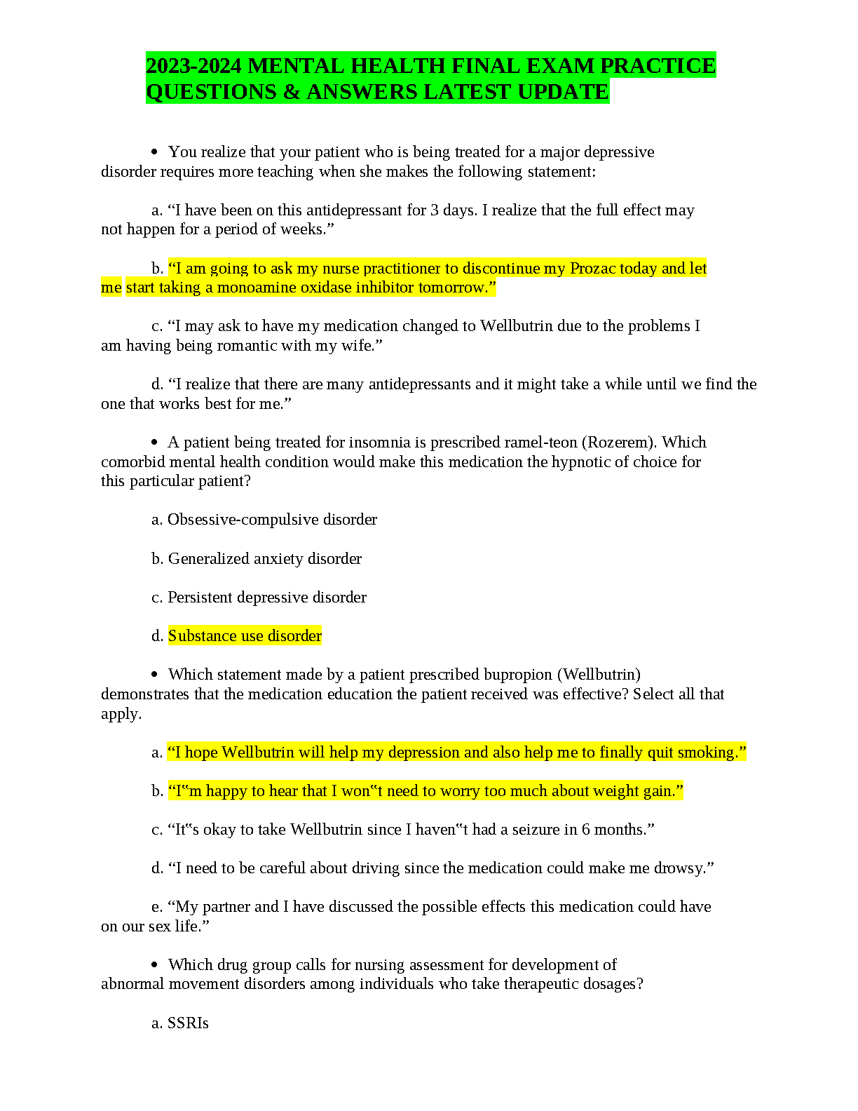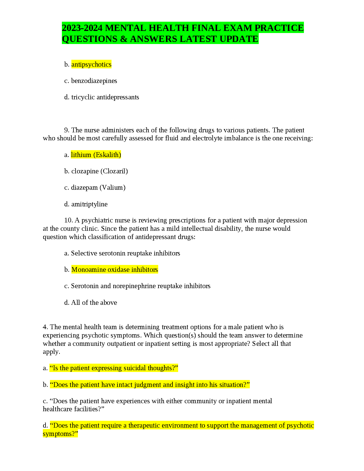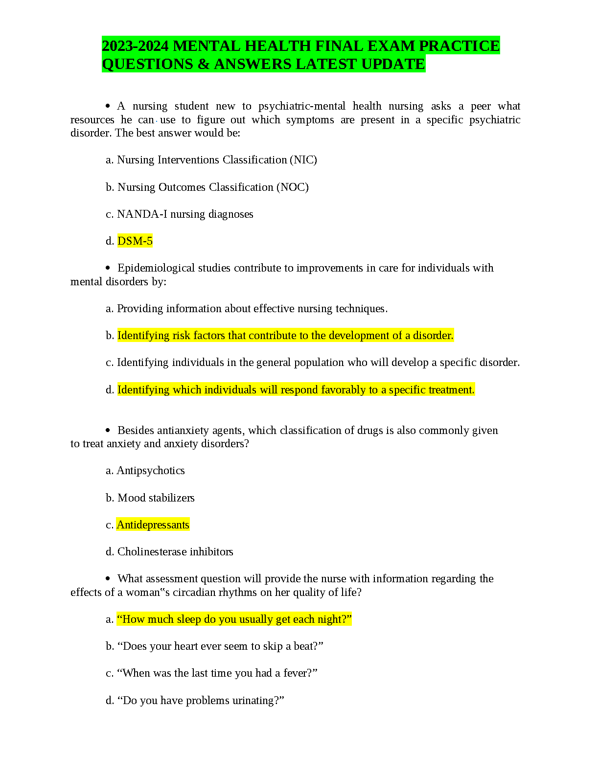 Mental Health Nursing Final Exam Test Bank: Latest 2025/2026 Practice Questions & Answers for Exam Success