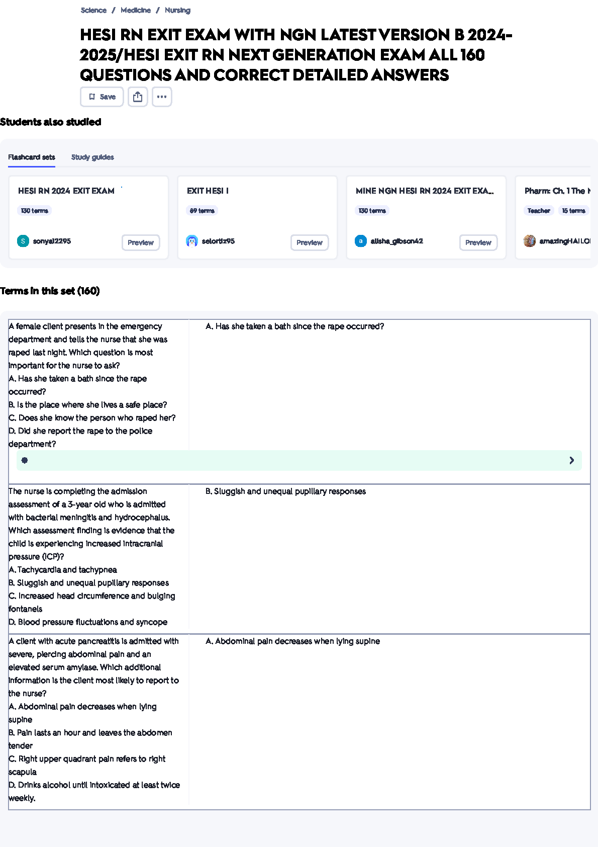 Get ready to ace the HESI RN Exit Exam with our comprehensive test bank for the Next Generation (NGN) Version B, updated for 2024-2025. This study guide features a complete set of 160 questions, each paired with a correct and detailed answer. Designed to mirror the actual exam, this resource is your key to mastering the material, building confidence, and passing on your first attempt. Perfect for nursing students seeking a reliable and thorough preparation tool to excel in their final nursing school milestone.