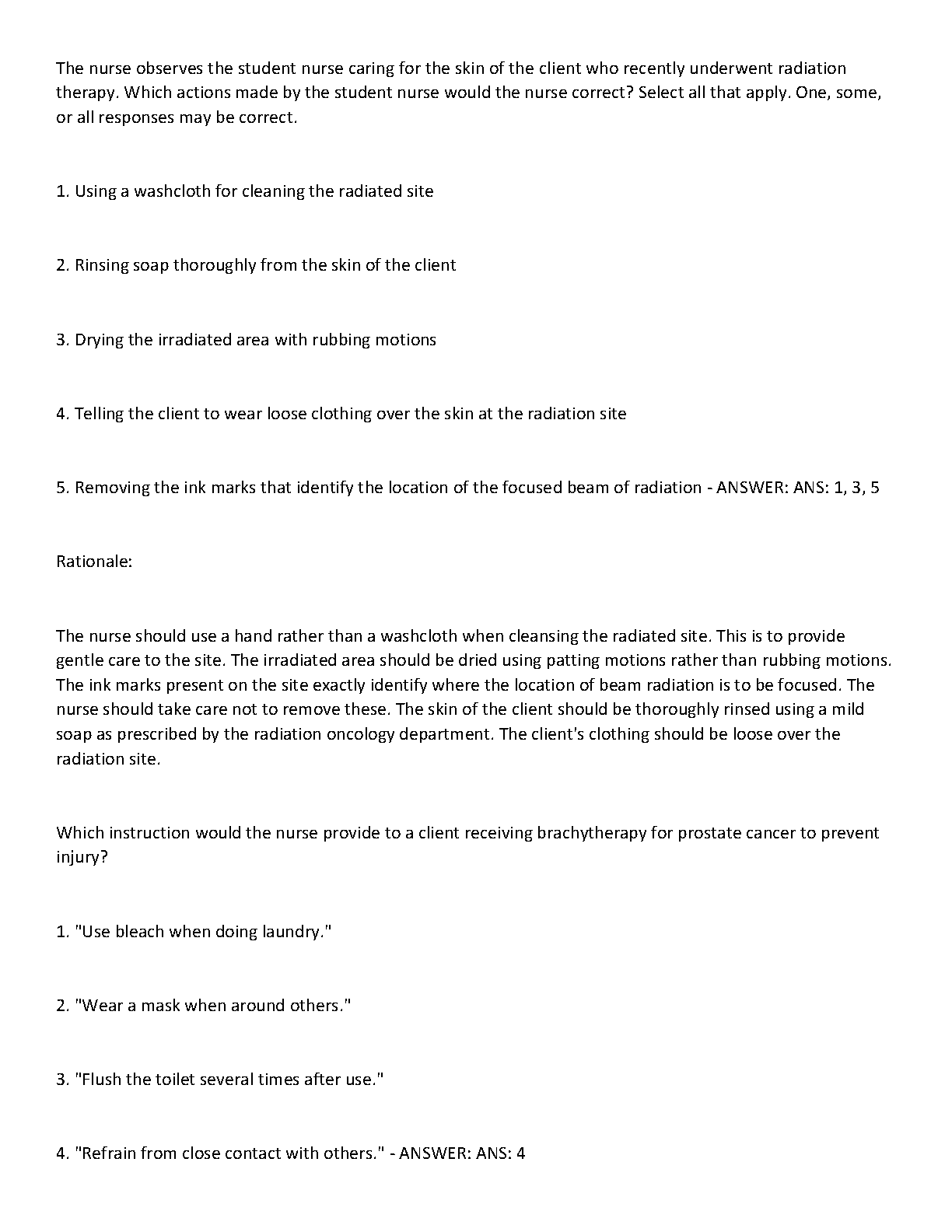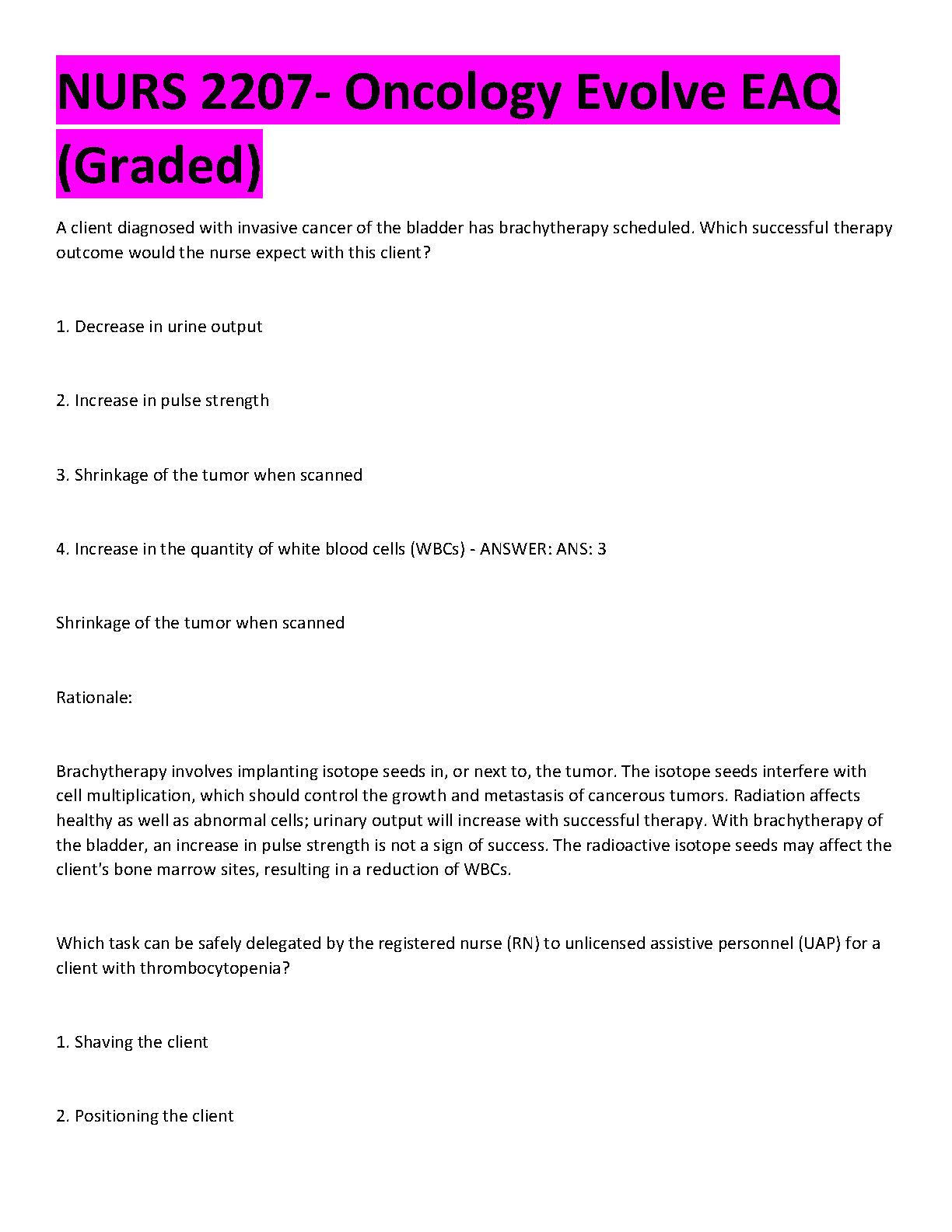 Unlock success in your NURS 2207 Oncology course with this comprehensive Evolve EAQ Test Bank. This graded collection features a wide array of exam-style questions, complete with verified answers and in-depth rationales, directly aligned with the 'Medical-Surgical Nursing, 11th Edition' textbook. Master critical topics such as cancer treatments like brachytherapy, patient care management, and safe delegation practices. This essential study guide is expertly designed to help you ace your exams, deepen your understanding of oncology nursing, and build the confidence needed for your clinical practice. Get immediate access to the tools you need to excel!