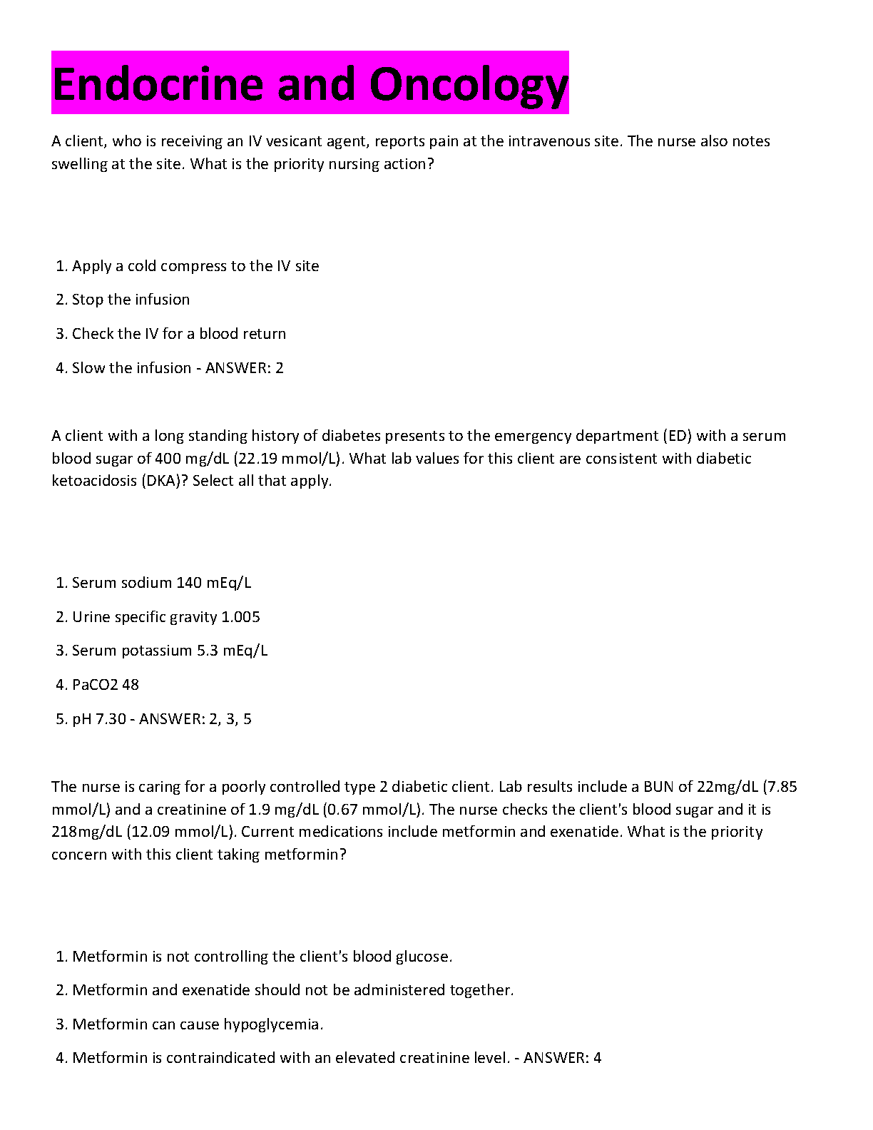 Unlock success in your nursing exams with our latest 2025/2026 Endocrine and Oncology Test Bank. This essential study guide is meticulously designed to help you master complex topics and pass your NCLEX on the first try. Inside, you'll find a comprehensive collection of practice questions covering critical areas such as diabetic ketoacidosis (DKA), IV vesicant agent management, medication contraindications like metformin, and interpreting lab values. Each question comes with a detailed answer and rationale, building your clinical reasoning skills and confidence. Stop worrying about resits and start preparing effectively to excel in your nursing career. Download now for instant access to the ultimate study tool for endocrine and oncology nursing.