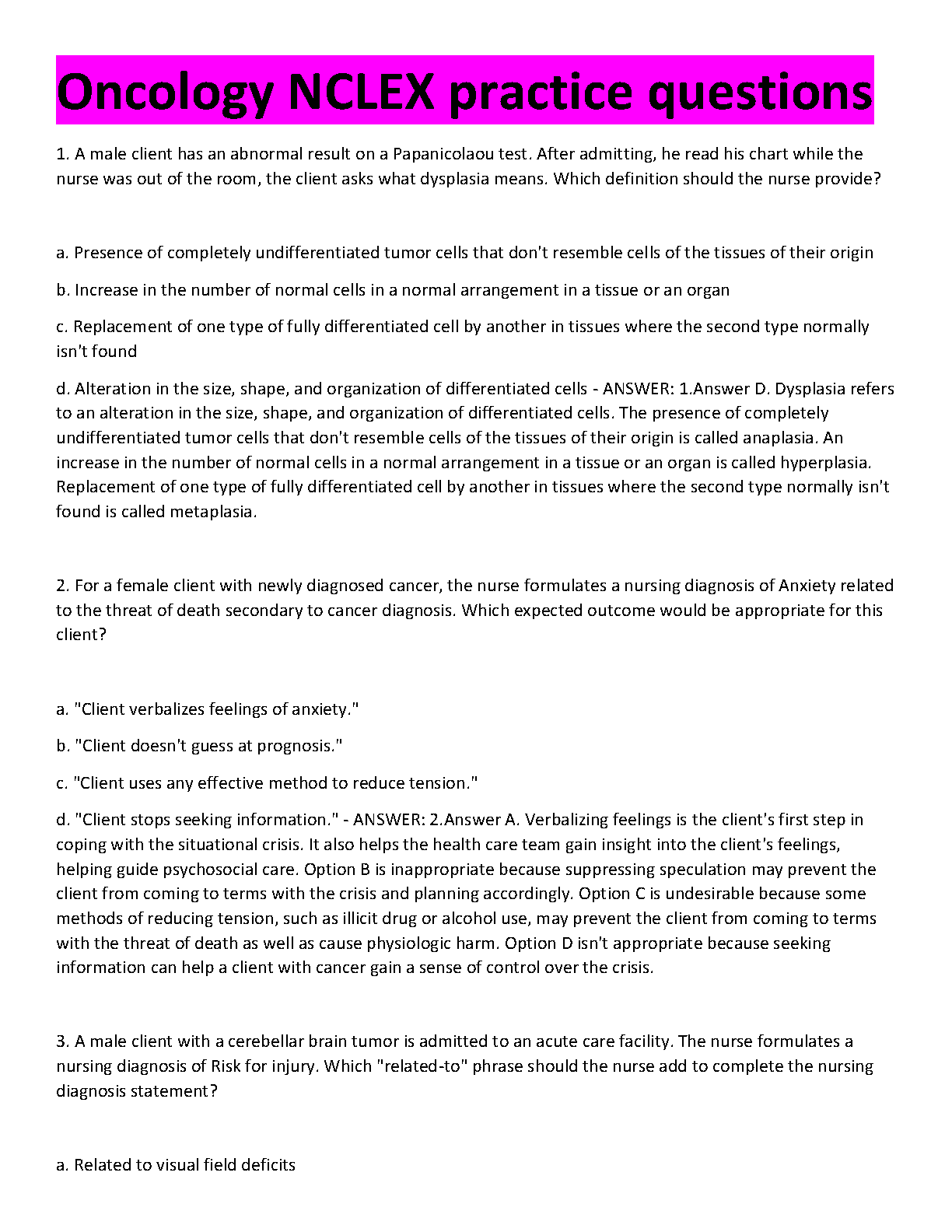 Get ready to conquer the oncology section of your NCLEX-RN exam with our latest 2025/2026 test bank! This comprehensive resource is packed with a wide range of practice questions covering critical oncology nursing concepts. Each question comes with a detailed, easy-to-understand rationale to deepen your knowledge and critical thinking skills. Move beyond simple memorization and truly grasp complex topics, from cellular pathologies like dysplasia to crafting effective nursing diagnoses for cancer patients. This study guide is expertly designed to help you build confidence, master the material, and pass your NCLEX exam on the very first attempt, saving you from the stress and cost of resits.