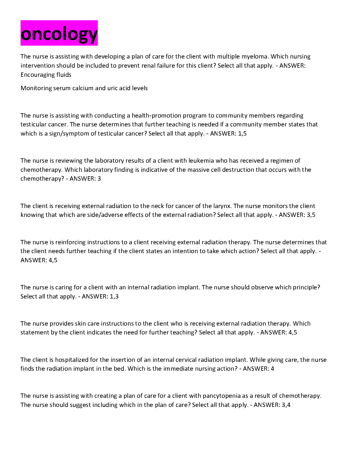 Ace your oncology nursing exams with this comprehensive test bank, fully updated for the 2025/2026 academic year. This essential study resource features a wide range of exam-style questions and answers covering critical oncology topics, including multiple myeloma, leukemia, testicular cancer, chemotherapy protocols, and radiation therapy side effects. Each question is designed to test your clinical reasoning and knowledge, mirroring what you'll see on your actual exams like the NCLEX and HESI. Master complex concepts, identify your weak points, and build the confidence you need to pass on your first attempt. Stop worrying about resits and start preparing effectively with this targeted oncology Q&A guide.
