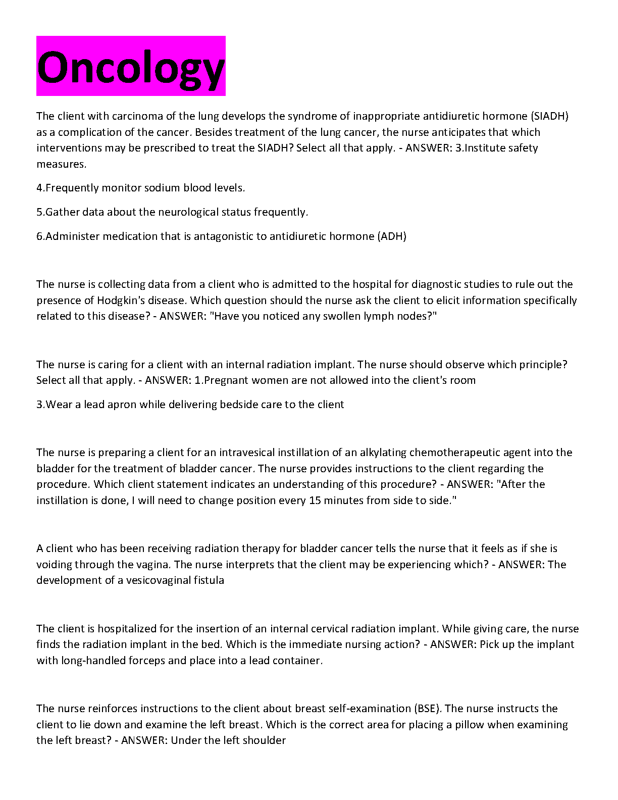 Master the complexities of cancer care and excel in your exams with this premium test bank for Oncology Nursing. Sourced from the highly-respected 'Saunders Comprehensive Review for the NCLEX-RN Examination, 9th Edition' by Linda Anne Silvestri, this study guide is your key to success. It features a curated collection of exam-style questions and verified answers on crucial topics, including SIADH, Hodgkin's disease, radiation therapy safety, and chemotherapy administration. Updated for the 2025 academic year, this resource is meticulously designed to help you pass your NCLEX, HESI, or other nursing board exams on your first attempt, ensuring you avoid costly and stressful resits.