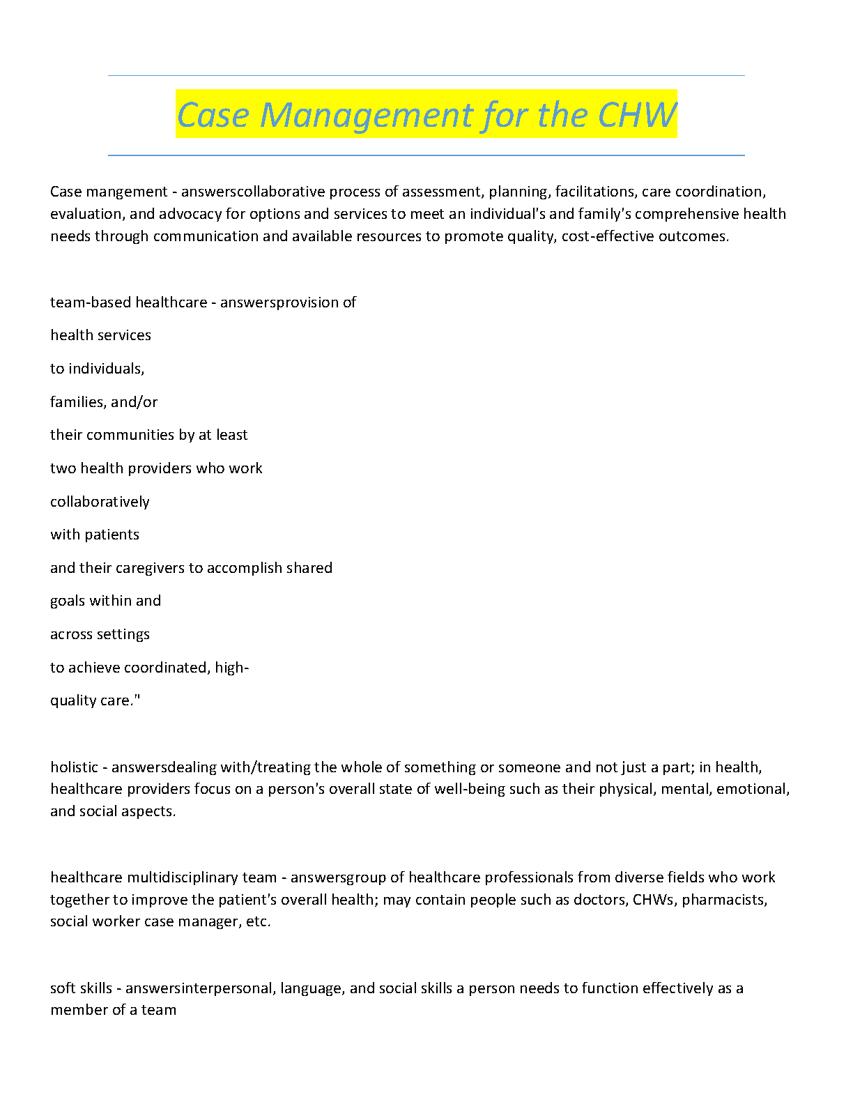 Unlock exam success with our comprehensive Exam Elaboration for 'Case Management for Community Health Workers' by Timothy Berthold. This 2025/2026 updated study guide provides detailed answers and definitions for all the essential concepts you need to know. Master key topics such as the collaborative process of case management, team-based healthcare, holistic patient care, multidisciplinary teams, and essential soft skills. This resource is expertly crafted to help you grasp complex topics quickly, ensuring you are fully prepared to pass your exams on the first try and excel in your CHW program. Avoid resits and build a strong foundation for your career with this indispensable study aid.