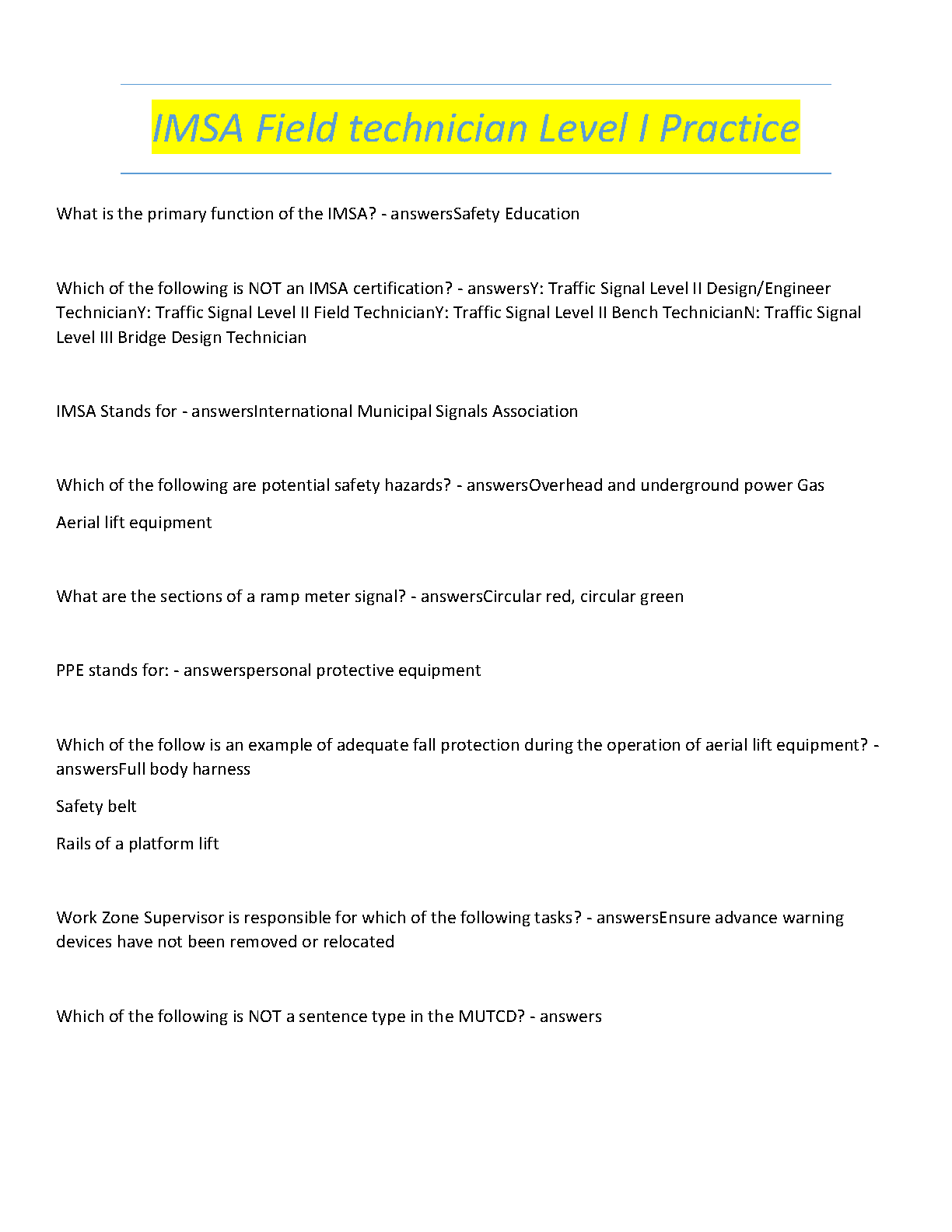 Ace your International Municipal Signal Association (IMSA) Field Technician Level I certification on the first try! This comprehensive test bank is your ultimate study tool, packed with the latest practice questions and verified answers. Covering all essential topics from safety protocols (PPE) and MUTCD standards to the core functions of the IMSA, this guide ensures you're fully prepared. Master the material, walk into your exam with confidence, and secure your certification without the stress of resits.