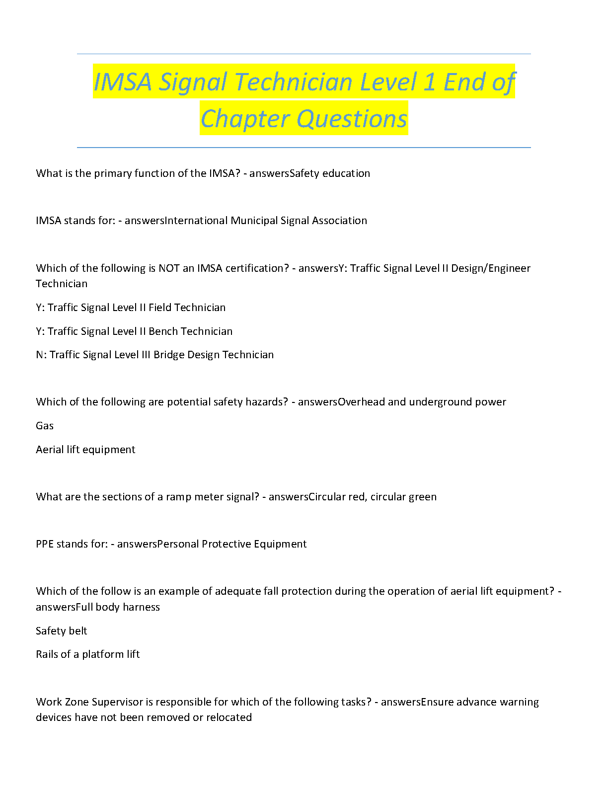 Prepare to ace your IMSA Signal Technician Level 1 certification exam with our newly updated 2025/2026 test bank. This comprehensive resource, based on material by the International Municipal Signal Association, provides a full collection of end-of-chapter questions and their correct answers. Gain the confidence you need to pass on your first attempt by mastering essential topics such as safety protocols, PPE usage, traffic signal components, and work zone management. This study guide is your key to avoiding resits and launching your career as a certified signal technician. Download now for instant access!