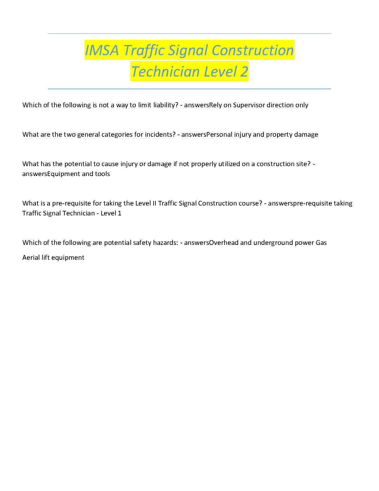 Achieve your IMSA Traffic Signal Construction Technician Level 2 certification with confidence using our comprehensive 2024-2025 test bank. This essential study guide provides a complete collection of real exam questions and verified answers, covering all critical topics such as job site safety, liability, incident management, and proper equipment use. Designed for candidates aiming to pass on their first attempt, this resource is your key to mastering the material and securing your professional credentials. Stop worrying about resits and start preparing effectively today!