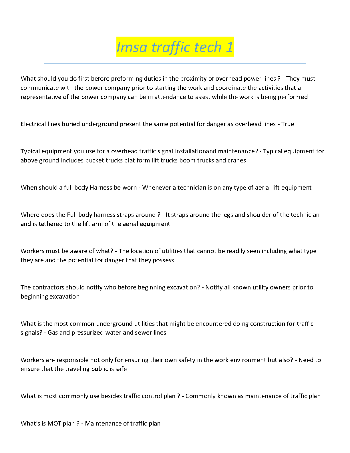 Prepare to ace your IMSA Traffic Signal Technician Level 1 certification with our latest 2025/2026 test bank! This comprehensive study guide features a detailed collection of verified questions and answers, covering all essential topics for the exam. Master crucial safety procedures for working near overhead and underground power lines, proper use of harnesses and aerial lift equipment, and protocols for excavation. Our Q&A format makes learning efficient, helping you grasp key concepts like Maintenance of Traffic (MOT) plans and ensure you're ready to pass on your first attempt. Get the confidence you need to launch your career as a certified traffic tech.