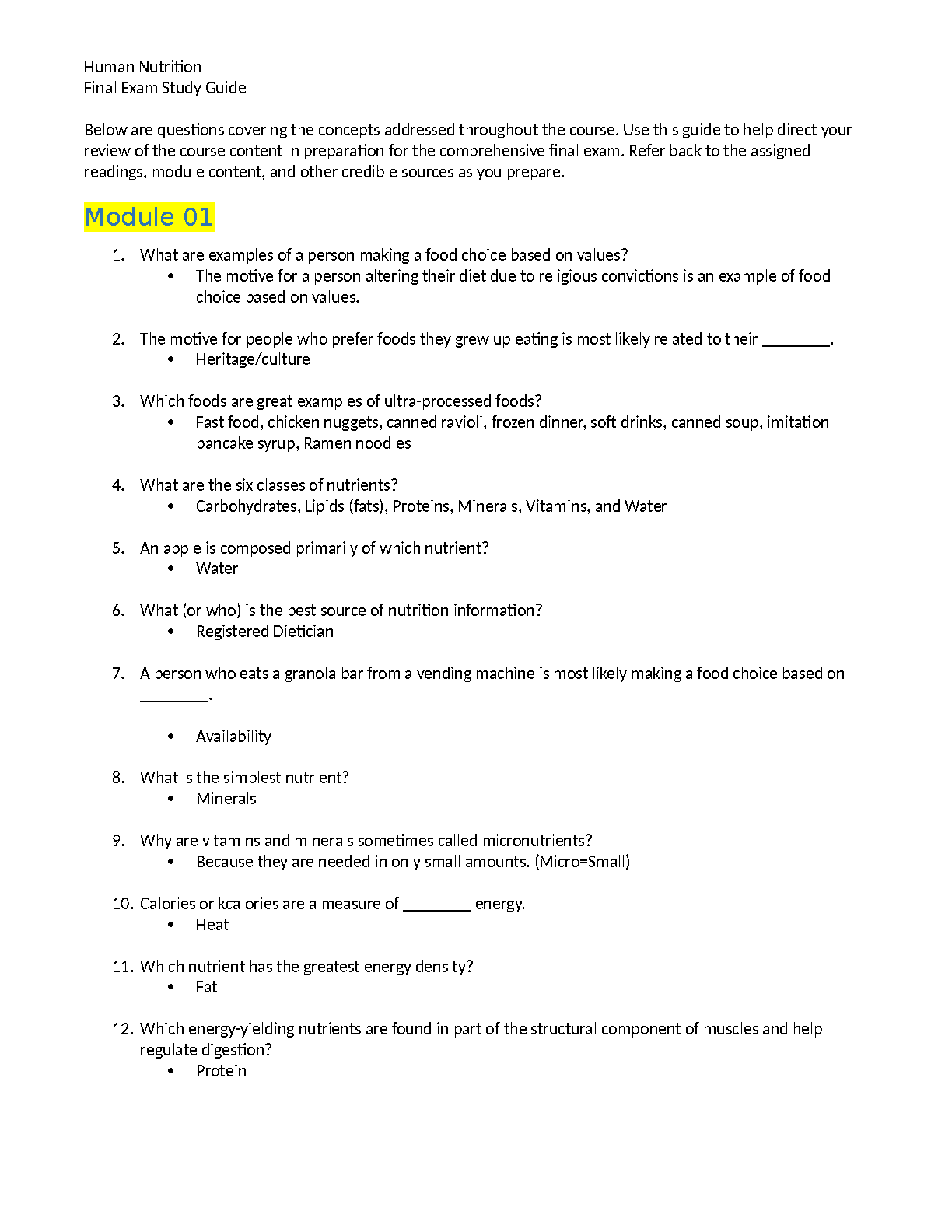 Unlock success in your Human Nutrition course with our latest 2025/2026 Final Exam Study Guide. This comprehensive resource provides detailed elaborations and Q&A covering all essential modules, starting with foundational concepts. Dive into topics like the six classes of nutrients, factors influencing food choices (values, culture, availability), understanding ultra-processed foods, micronutrients, and energy-yielding nutrients. This guide is expertly crafted to streamline your preparation, helping you grasp key concepts efficiently and pass your final exam on the very first try. Say goodbye to exam stress and avoid resits with this ultimate study companion.