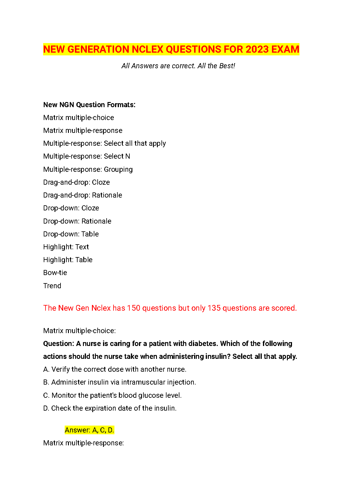 Prepare to conquer the Next Generation NCLEX with our latest 2025/2026 Test Bank! This comprehensive study resource is specifically designed to familiarize you with all the new NGN question formats, including Matrix multiple-choice, 'Select all that apply', Drag-and-drop, Bow-tie, and more. Our guide features a curated collection of practice questions that mirror the real exam's structure and difficulty. Each question comes with a verified, correct answer, providing you with the essential practice needed to build confidence and master critical thinking skills. Stop worrying about resits and ensure you pass the NCLEX on your very first try with this essential preparation tool.