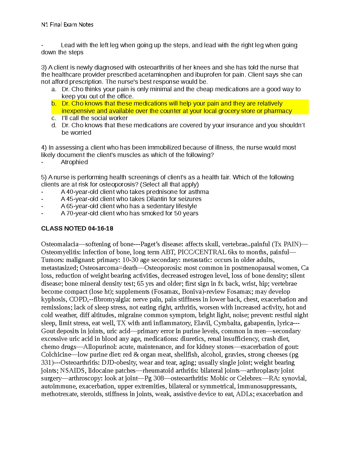 Master your N1 final exam with this essential 2025/2026 study guide! This comprehensive resource is packed with detailed questions and verified answers covering crucial nursing topics like adolescent patient safety, proper use of restraints, emergency fire protocols, staff injury prevention, and musculoskeletal assessment techniques. Each question is designed to mirror the format of your final exam, with correct answers clearly highlighted to streamline your study process. Prepare effectively, build confidence, and ensure you pass your nursing finals on the first attempt with these expertly curated exam notes.