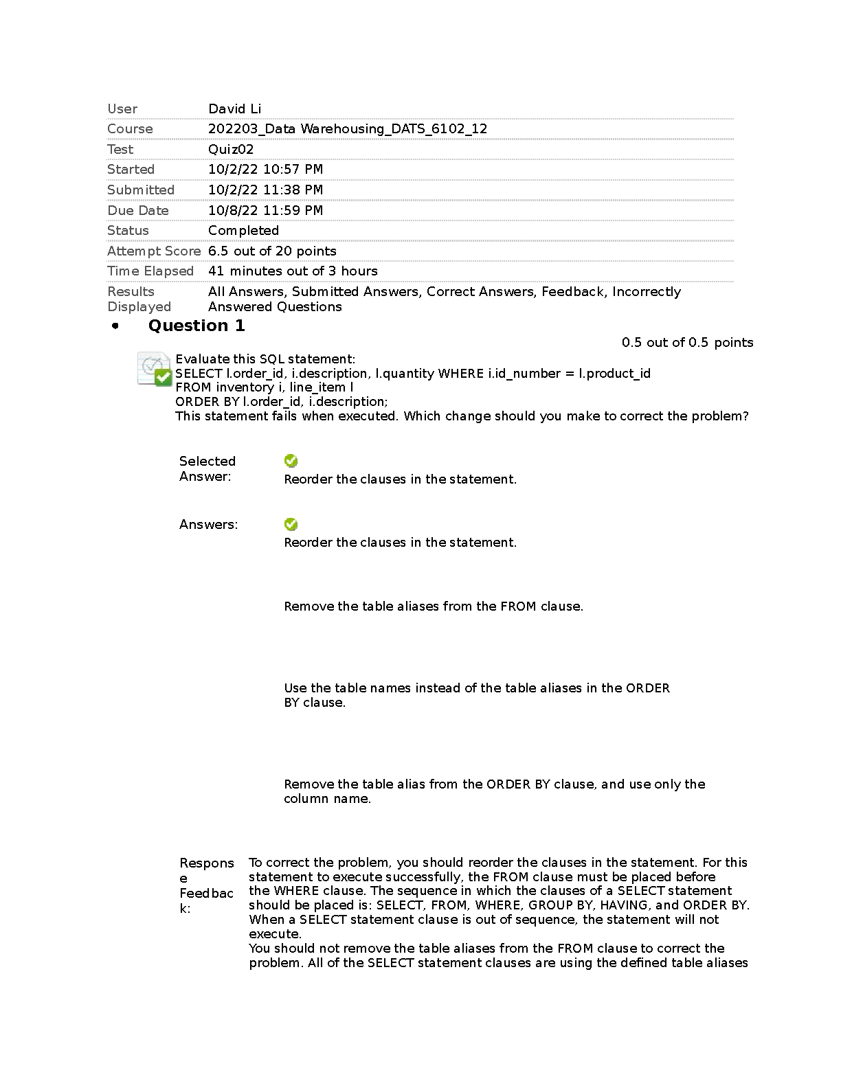 Unlock success in your DATS 6102 Data Warehousing course with this essential study resource for Quiz 2. This guide provides a complete set of questions along with verified correct answers and detailed, step-by-step explanations. Understand the logic behind each solution, such as the correct order of clauses in an SQL statement, to master the material effectively. Updated for the 2025/2026 academic year, this is the perfect tool to help you prepare thoroughly, pass your exam on the first attempt, and avoid resits. Solidify your knowledge and boost your grade with these expertly explained answers.
