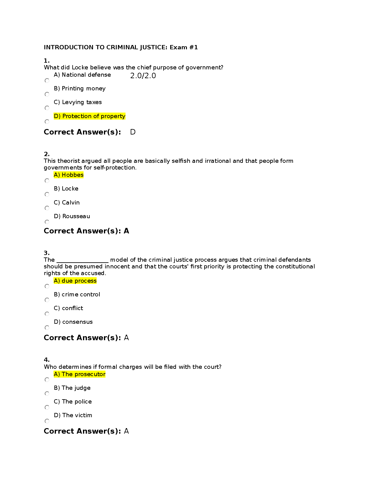 Master the fundamental concepts of your criminal justice course with our detailed Test Bank for Exam 1, designed for the 18th Edition of 'Introduction to Criminal Justice' by Siegel and Worrall. This study guide features a curated collection of exam-style questions with verified correct answers, covering essential topics such as the philosophies of Locke and Hobbes, the due process model, and the functions of the court system. Stop guessing and start studying effectively. This resource is your key to understanding complex topics and achieving a high score on your first attempt. Download today and walk into your exam with confidence!