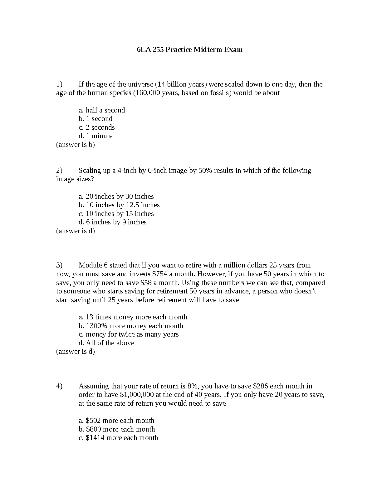 Ace your 6LA 255 midterm with our latest 2025/2026 Practice Exam Test Bank. This essential study resource provides a comprehensive set of exam-style questions, complete with verified answers, covering key quantitative reasoning topics like scaling, percentages, and personal finance for retirement. This guide is specifically designed to help you understand the core concepts, master the material, and pass your exam with confidence on the first attempt, saving you from the stress of resits. Get fully prepared for success in 6LA 255!