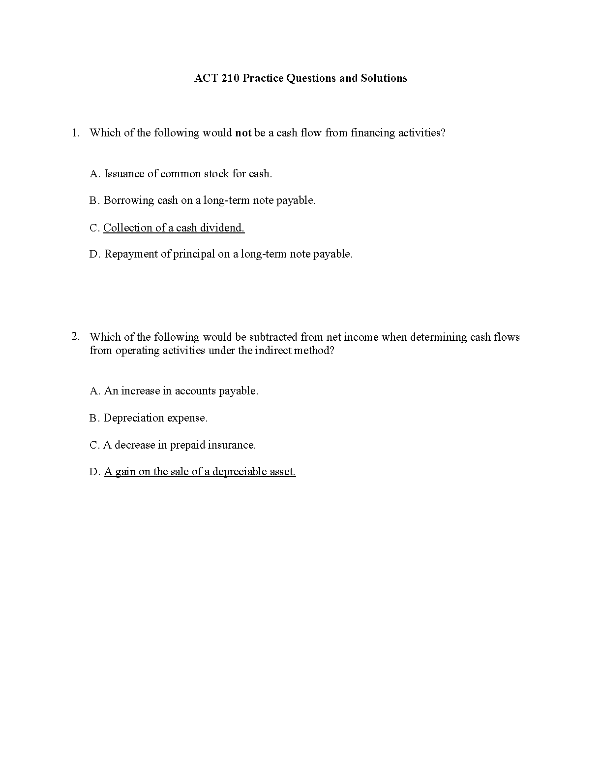 Prepare to ace your ACT 210 Principles of Accounting course with our complete test bank, featuring an extensive collection of practice questions and meticulously verified solutions. This study guide is expertly crafted to cover key topics, including the Statement of Cash Flows, financing activities, and the indirect method for operating activities. By using this resource, you'll gain the confidence and knowledge needed to tackle your exams head-on, ensuring you pass on your first attempt and avoid costly resits. Master the essential concepts and achieve academic success with this indispensable tool.