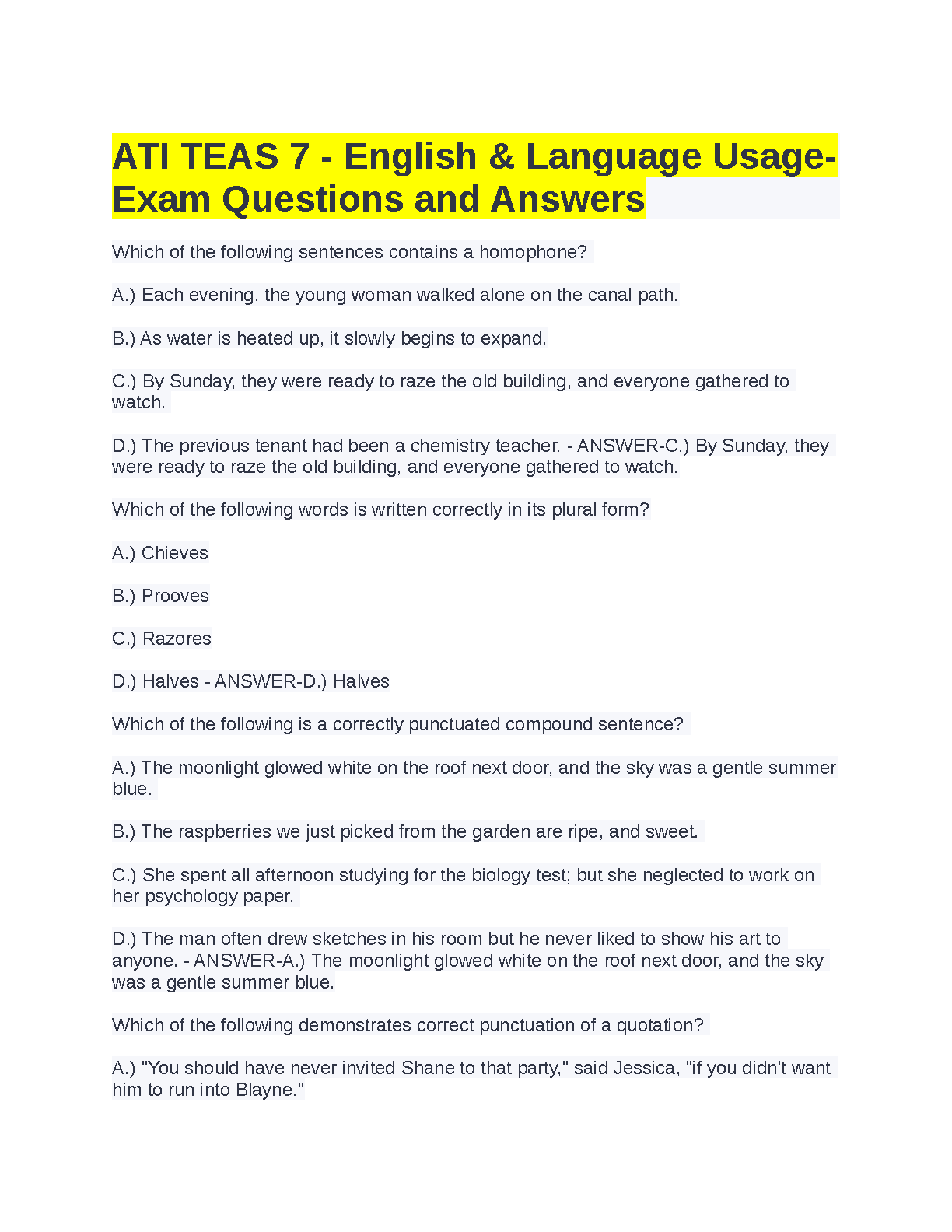 Prepare to excel on the ATI TEAS 7 English & Language Usage section with our comprehensive test bank, straight from the creators at ATI, LLC. This study guide features a complete collection of the latest exam-style questions, each with a verified and detailed answer. Boost your understanding of critical topics like grammar, punctuation, sentence structure, and vocabulary. Perfect for aspiring nursing students, this resource is designed to help you pass the TEAS 7 exam with confidence on your very first attempt. Download now to start practicing and secure your spot in your desired nursing program.