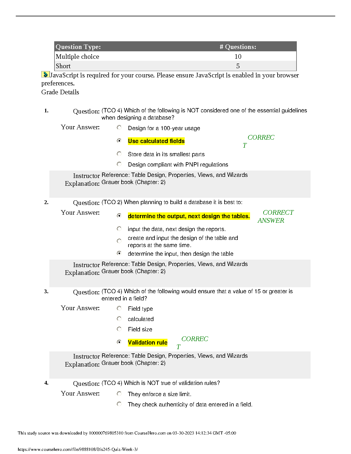 BIS245 Week 3 Quiz Test Bank with Correct Answers | Exploring Microsoft Access 2019 Edition by Grauer, Poatsy, Mulbery & Hogan