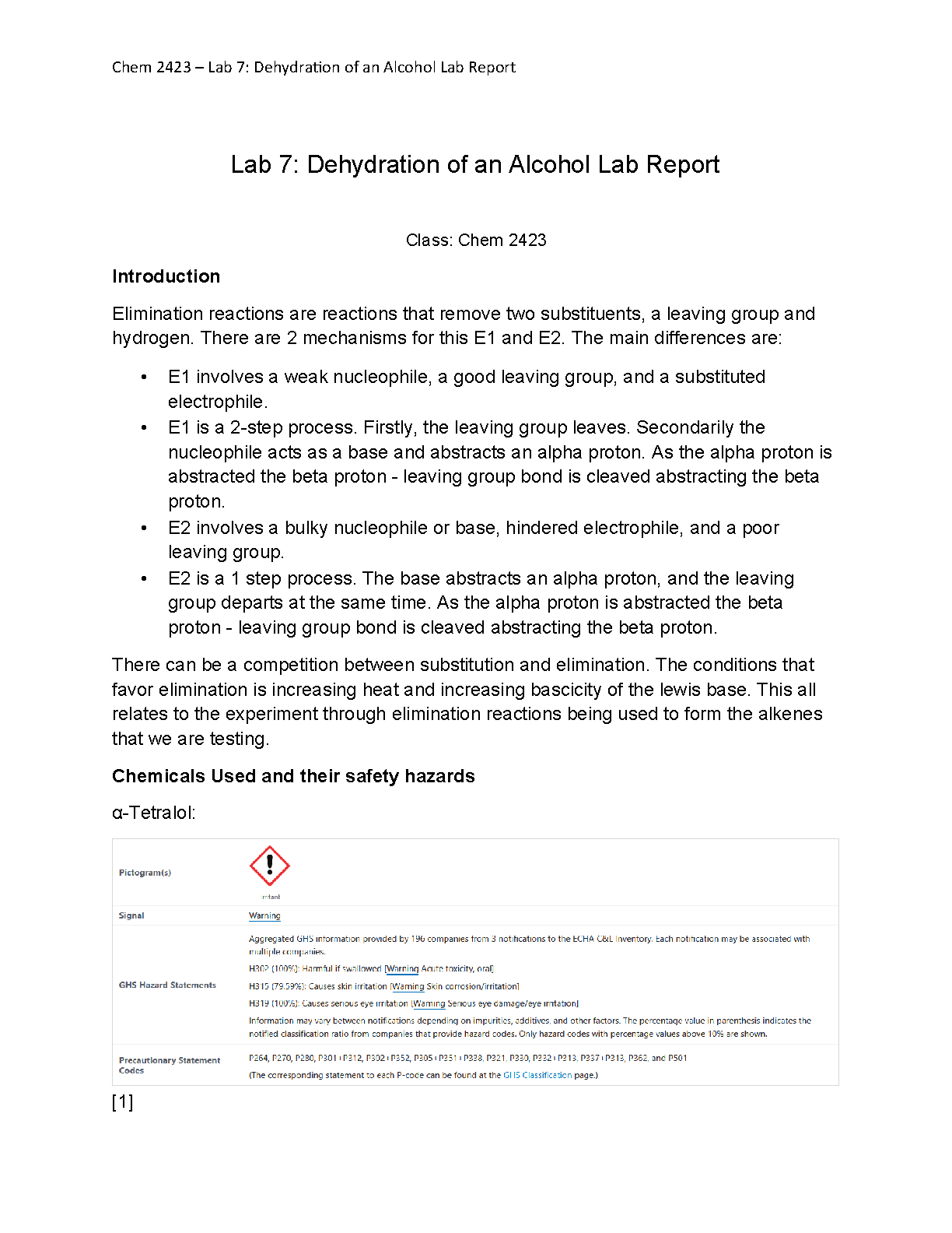 Chem 2423 Lab Report: In-Depth Analysis of Alcohol Dehydration & E1/E2 Mechanisms | 2025/2026 First Attempt Success Guide