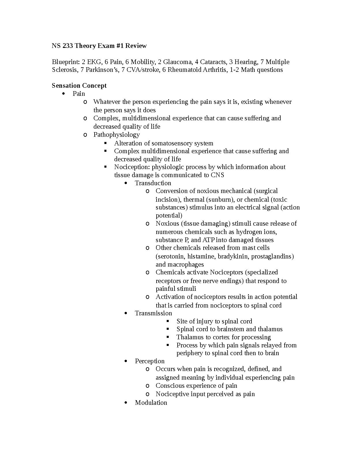 NS 233 Theory Exam 1 Ultimate Review Guide 2025/2026: Master Sensation, Pain, and Neurological Concepts to Pass on Your First Attempt
