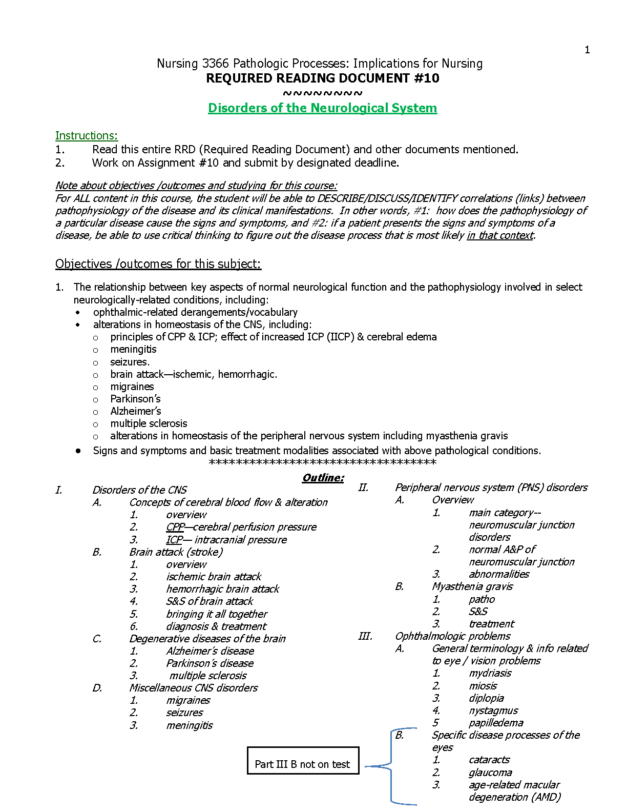 Ace your Nursing 3366 Pathologic Processes exam with this comprehensive study guide for the 2025/2026 academic year. This detailed exam elaboration focuses on 'Disorders of the Neurological System' and is designed to help you master the material and pass on your first try. The guide provides a clear and structured outline covering key objectives, including the pathophysiology and clinical manifestations of major neurological conditions. Topics include: Disorders of the CNS (Cerebral Blood Flow, Stroke, Alzheimer's, Parkinson's, MS, Seizures), Disorders of the PNS (Myasthenia Gravis), and Ophthalmologic Problems (Cataracts, Glaucoma, AMD). This resource is your key to understanding the link between disease processes and patient symptoms, ensuring you're fully prepared for your exams and avoiding any resits.