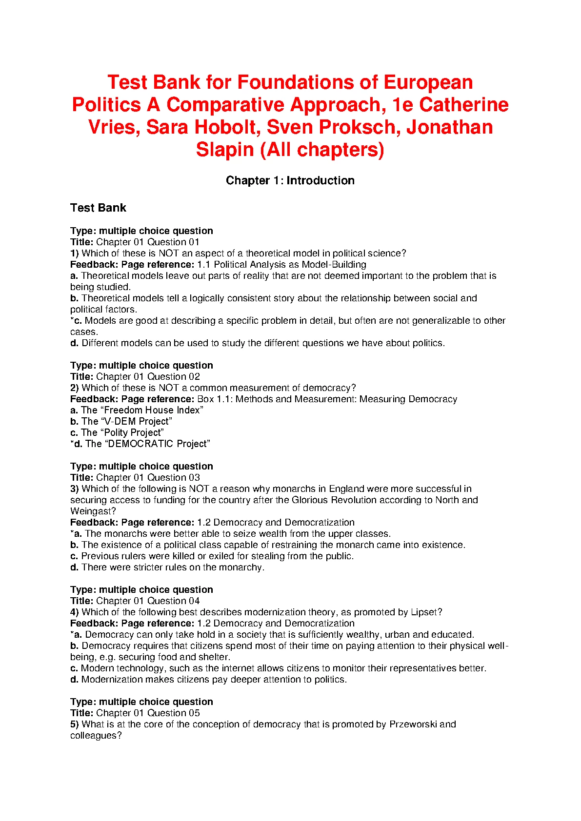 Test Bank for Foundations of European Politics A Comparative Approach, 1ST EDITION BY Catherine Vries, Sara Hobolt, Sven Proksch, Jonathan Slapin (All chapters). DOWNLOAD on www.hackedexams.com INSTANTLY.