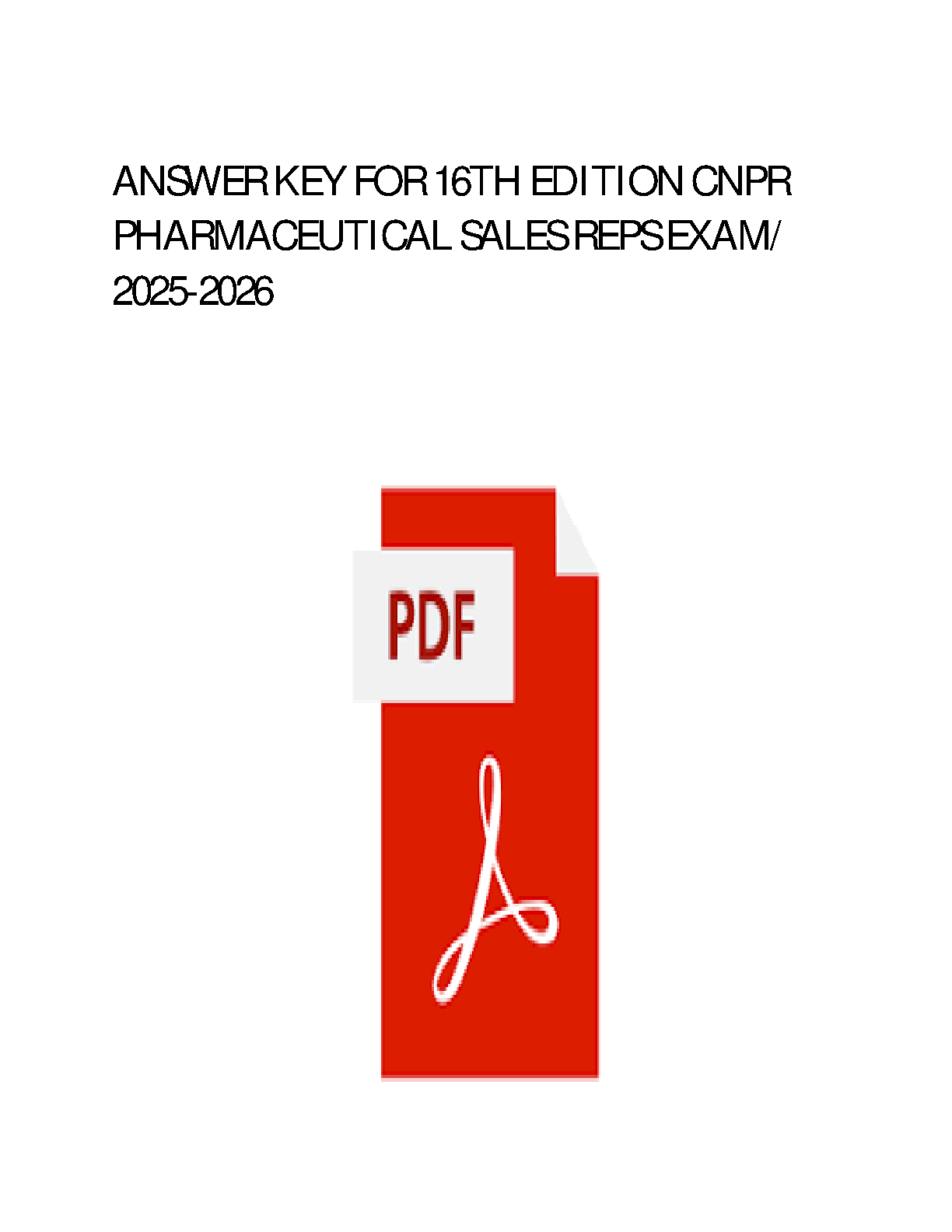 Unlock success in your pharmaceutical sales career with the definitive Test Bank and Answer Key for the CNPR Pharmaceutical Sales Representative Training Manual, 16th Edition, by the NAPSR. This resource, fully updated for the 2025-2026 certification exam, provides meticulously verified answers to help you master the core concepts. Streamline your study process, pinpoint areas for improvement, and gain the confidence needed to pass the CNPR exam on your first try. Secure your certification and advance your career with this essential preparation tool.