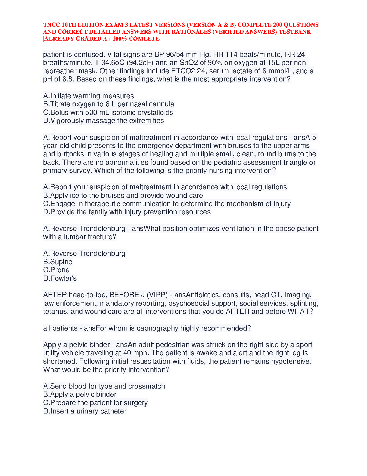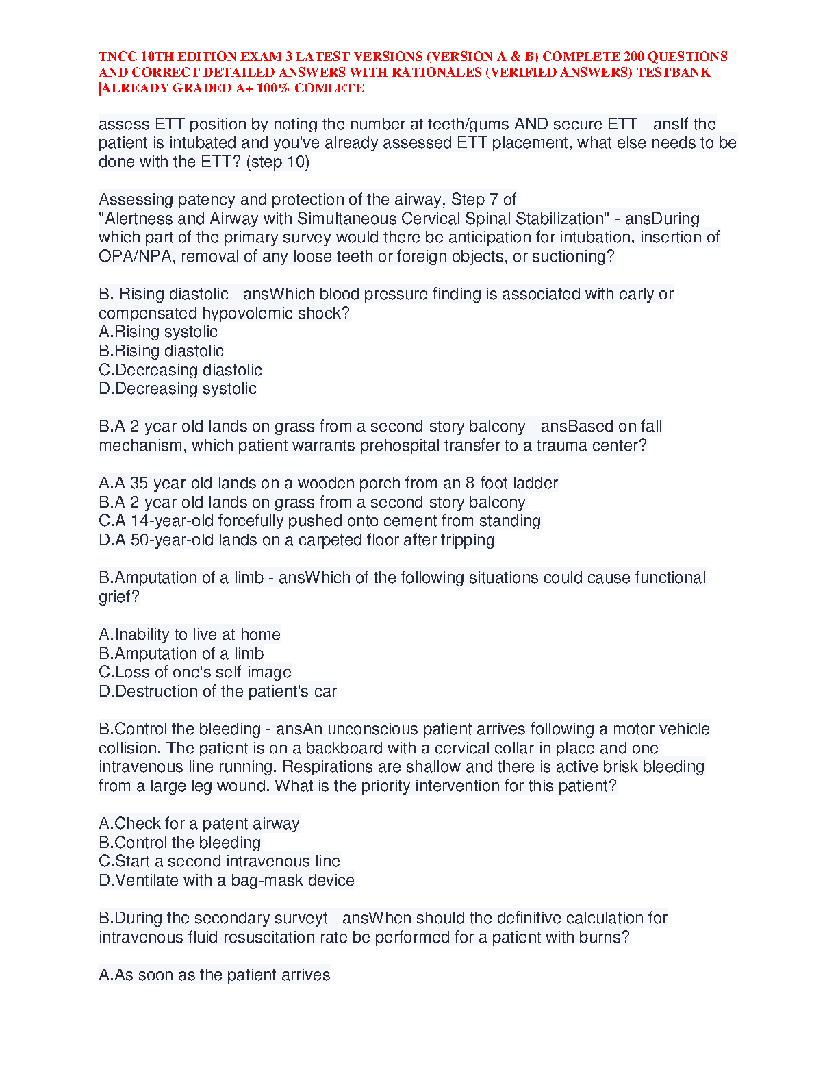 Ace your Trauma Nursing Core Course certification with our comprehensive test bank for the TNCC 10th Edition, Exam 3, developed by the Emergency Nurses Association (ENA). This essential study resource includes the latest A & B versions, featuring 200 meticulously compiled questions, each with verified, detailed answers and rationales. Designed to guarantee an A+ grade, this guide provides the in-depth knowledge and practice you need to master trauma care concepts and pass your exam with confidence. Get immediate access to a 100% complete and accurate study tool.