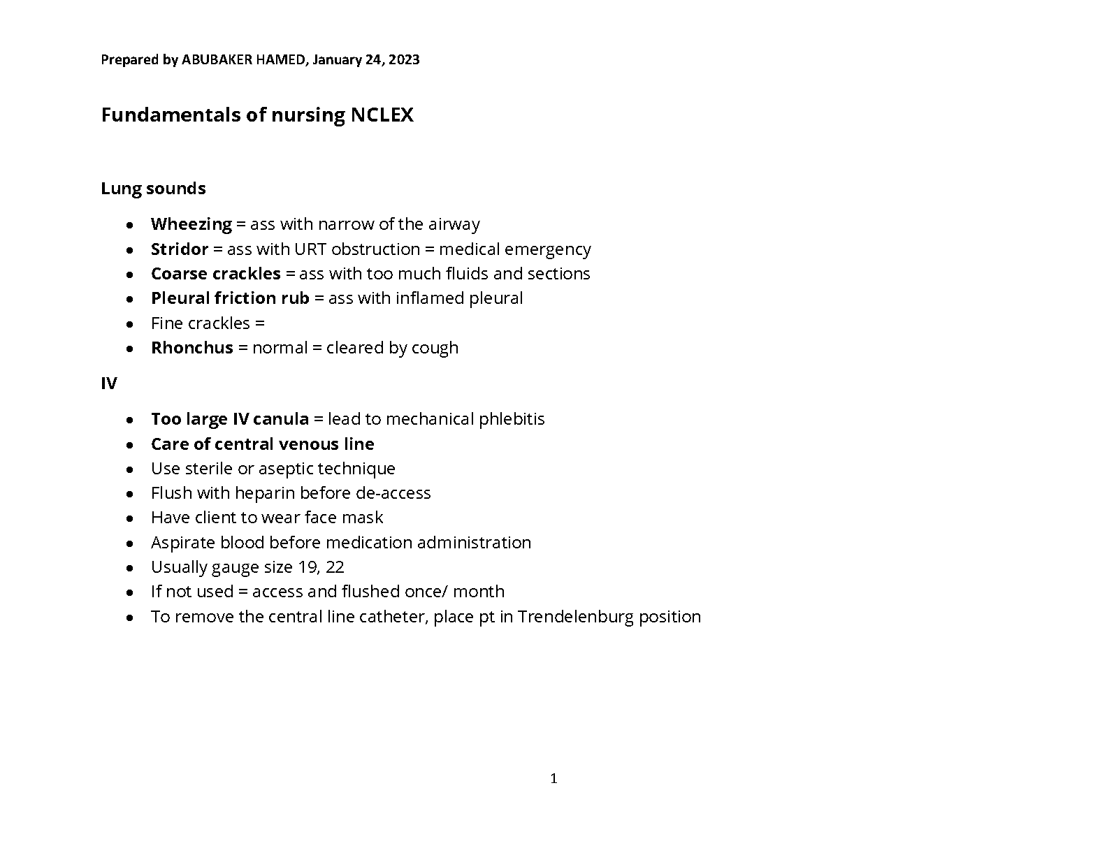 Ace your NCLEX exam with confidence using our comprehensive study notes for Fundamentals of Nursing, updated for the 2025/2026 academic year. This essential guide distills the most critical information from Taylor, Lynn & Marinis' 10th Edition into an easy-to-digest format. It covers vital topics such as differentiating lung sounds (wheezing, stridor, crackles) and essential IV and central line care protocols. Designed specifically to help nursing students master the core concepts, this resource is your ultimate tool for passing the NCLEX on your very first try and avoiding costly resits. Get the focused knowledge you need to succeed!