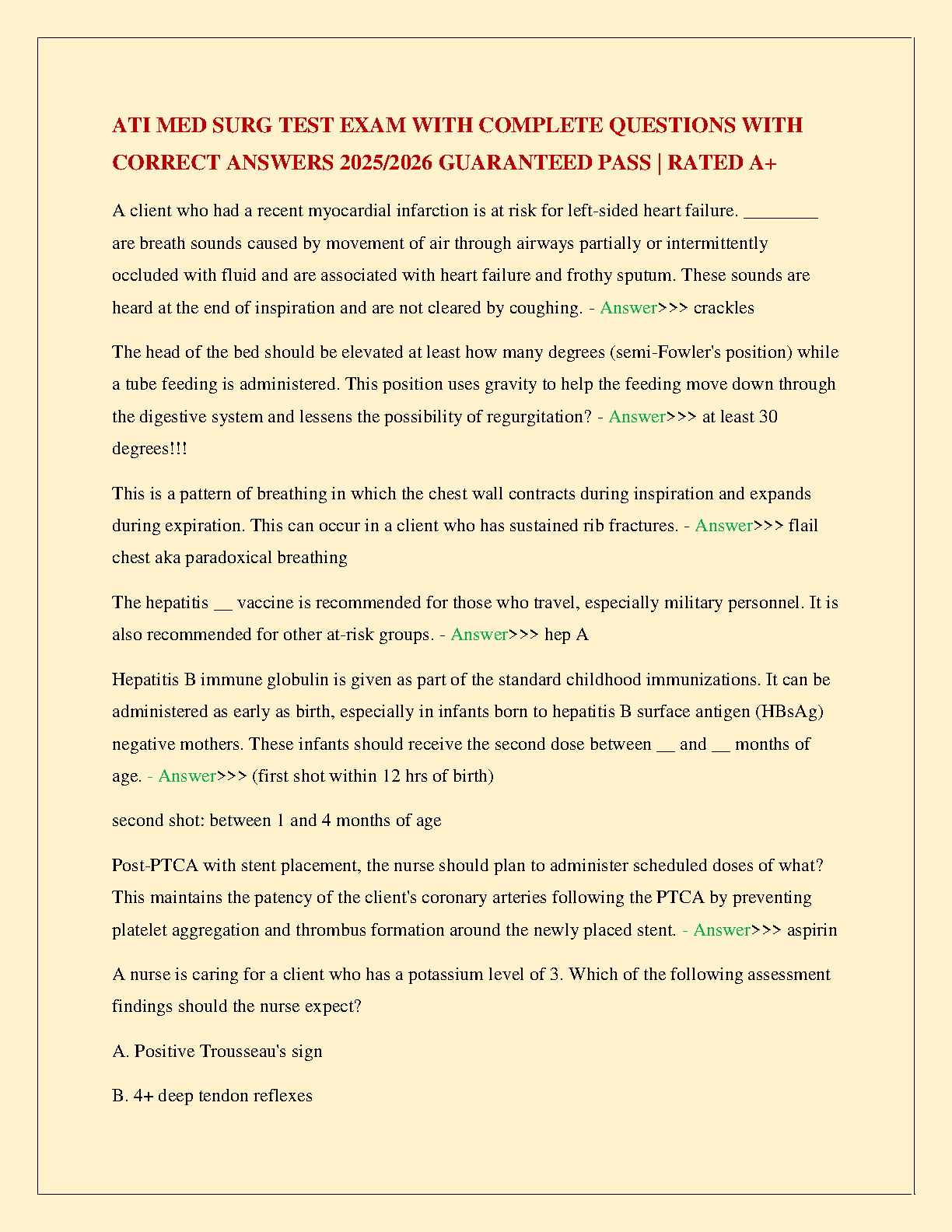 Ace your ATI Medical-Surgical exam on the first try with our expertly compiled 2025-2026 test bank. This premium study resource features a complete collection of exam-style questions paired with detailed, 100% accurate answers. Covering crucial Med-Surg topics such as cardiovascular care, respiratory distress, post-operative management, and more, this guide is designed to give you the confidence and knowledge needed to achieve an A+ grade. Stop worrying about resits and start studying smart with this guaranteed-to-pass resource, meticulously updated for the latest curriculum.