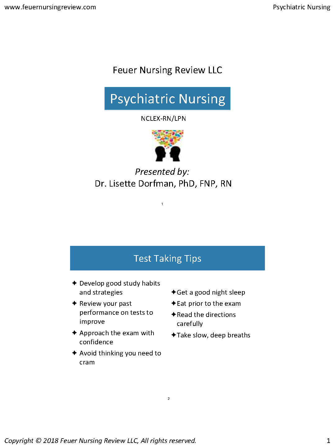 Ace your Psychiatric Nursing exam with this comprehensive NCLEX-RN/LPN review guide from Feuer Nursing Review, presented by Dr. Lisette Dorfman. This newly updated resource for the 2025/2026 academic year is expertly designed to provide you with the critical knowledge and effective test-taking strategies needed to succeed. Master complex concepts, improve your performance, and approach your exam with confidence. Download now to ensure you pass the NCLEX on your very first try and avoid costly resits.