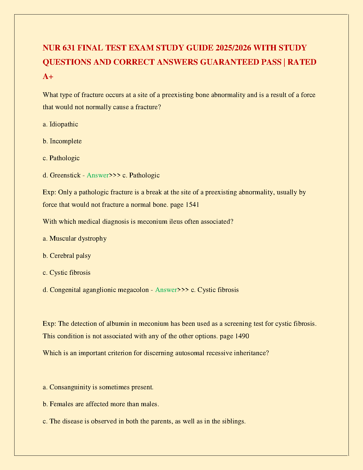 Prepare to excel in your NUR 631 Final Exam with our latest 2025/2026 Test Bank. This comprehensive study guide is meticulously crafted to help you pass on your first attempt and avoid resits. It features an extensive collection of real exam-style questions, each accompanied by detailed, verified answers and explanations. Covering all key topics from the NUR 631 curriculum, this resource is designed to boost your confidence and ensure you achieve an A+ grade. Master the material and walk into your final exam fully prepared!
