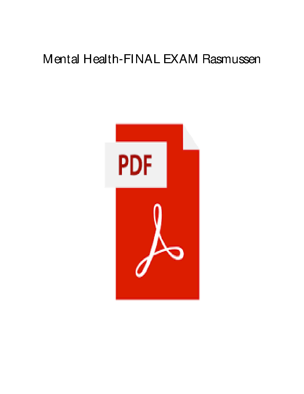 Ace your Rasmussen Mental Health final exam with this comprehensive test bank! This is a complete collection of questions and answers designed to help you master the key concepts from Varcarolis' Foundations of Psychiatric-Mental Health Nursing, 9th Edition. Updated for the 2025/2026 academic year, this study guide provides an in-depth review of all essential topics, ensuring you're fully prepared to excel on your exam. Stop stressing and start studying smart. Download now to gain the confidence you need to pass on your first attempt and avoid resits!