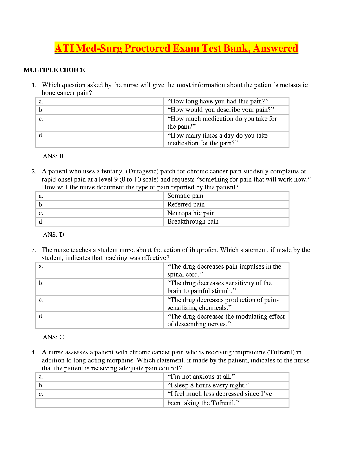 Master your ATI Med-Surg Proctored Exam with our comprehensive test bank, meticulously compiled for the latest nursing curriculum. This essential study guide features a vast collection of multiple-choice questions, complete with detailed, verified answers, mirroring the format and difficulty of the actual exam. Covering all critical medical-surgical nursing topics, this resource is designed to help you identify your strengths and weaknesses, solidify your knowledge, and build the confidence needed to pass on your first attempt. Ace your exam and take a confident step forward in your nursing career with this ultimate preparation tool.