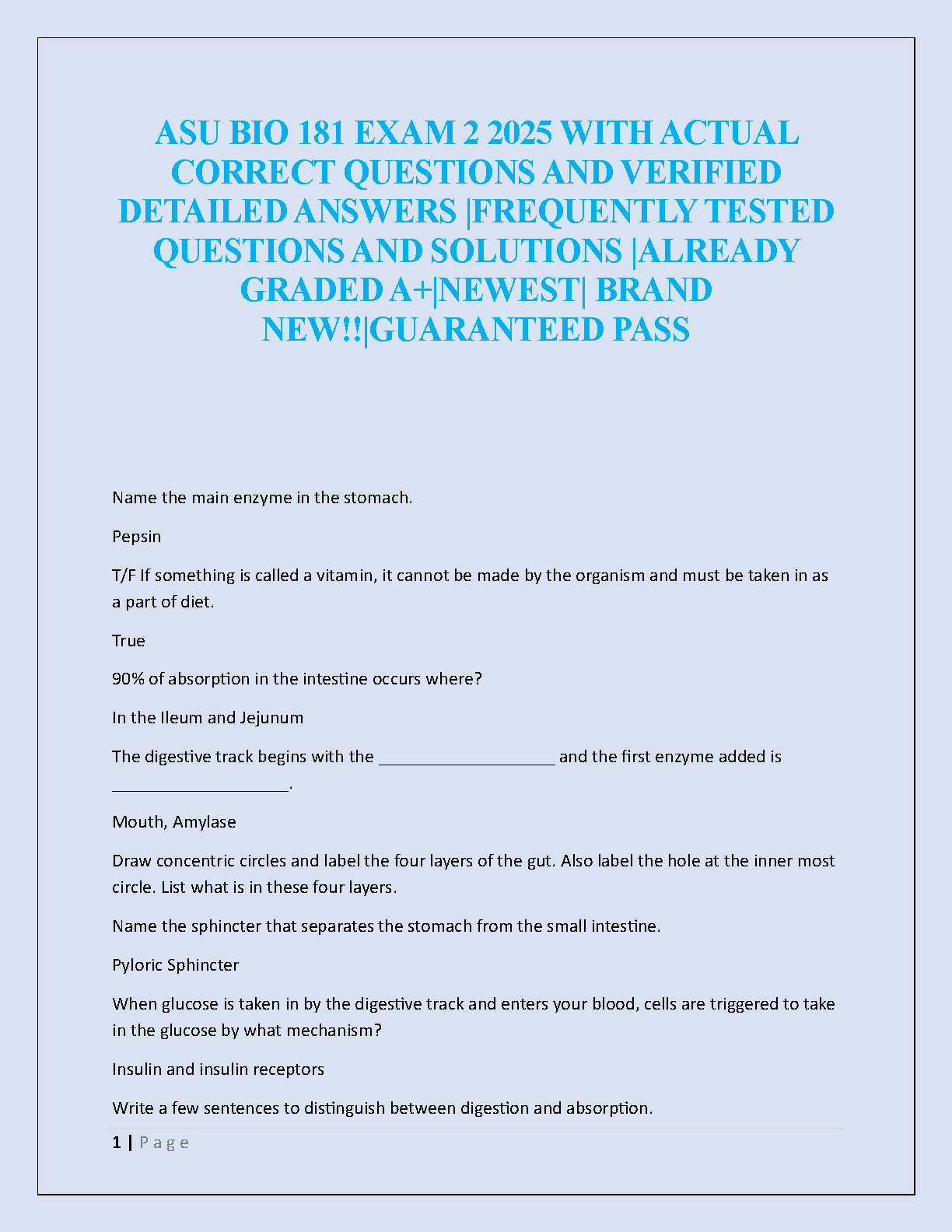 Achieve an A+ in ASU's BIO 181: General Biology I with this comprehensive test bank for Exam 2, updated for the 2025-2026 academic year. This essential study guide features a collection of frequently tested questions complete with verified, detailed answers and solutions. Covering key topics like the digestive system, enzymes, and nutrient absorption, this resource is expertly designed to help you master the material and pass your exam with confidence on the first attempt. Don't leave your grade to chance—use this brand new, A+ graded resource to guarantee your success and avoid resits.