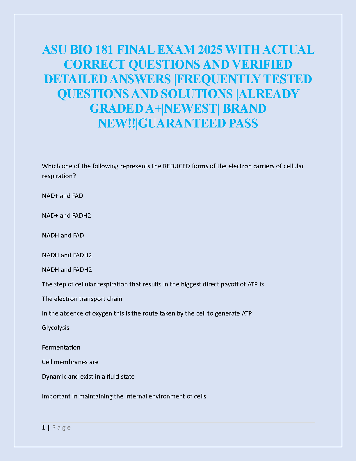 Prepare to excel in your ASU BIO 181 Final Exam with our comprehensive, newly released study guide for the 2025/2026 academic year. This essential resource features a collection of frequently tested exam questions, each with verified, detailed answers to ensure you master the core concepts. Meticulously curated to help you pass on your first attempt and secure an A+ grade, this guide covers key topics such as cellular respiration, electron carriers, and cell membrane dynamics. Download this proven study aid today and confidently achieve success in your General Biology I course.