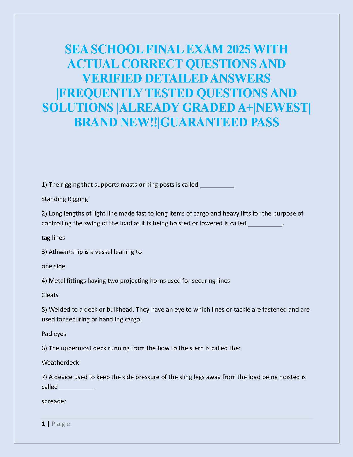 Ace your Sea School Final Exam with our 2025 Test Bank. This comprehensive study guide features a complete collection of actual, frequently tested questions, each with verified, correct answers. Designed to help you master key maritime concepts and terminology, this resource is your ultimate tool for achieving an A+ grade. Prepare effectively, understand the material deeply, and pass your exam with confidence. Get the latest, brand-new questions and solutions for a guaranteed pass.