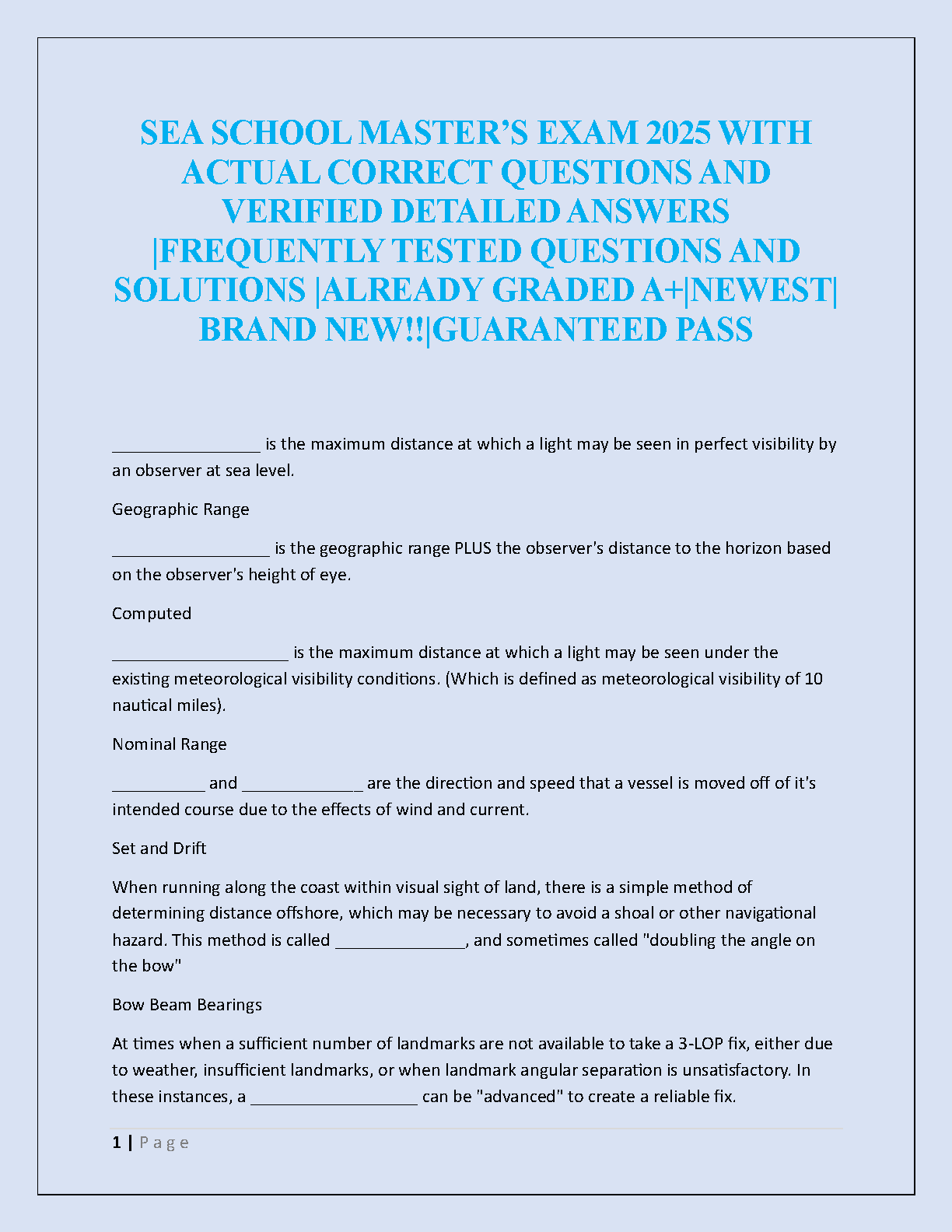 Ace your USCG Master's License exam with the latest 2025-2026 Test Bank from Sea School. This comprehensive resource is packed with frequently tested questions and meticulously verified, detailed answers to ensure you're fully prepared. Achieve an A+ grade and pass on your first attempt, avoiding costly resits. Our study guide covers all critical topics in maritime navigation, including Geographic Range, Nominal Range, and Set and Drift. Download now for a guaranteed pass and take the next step in your maritime career!